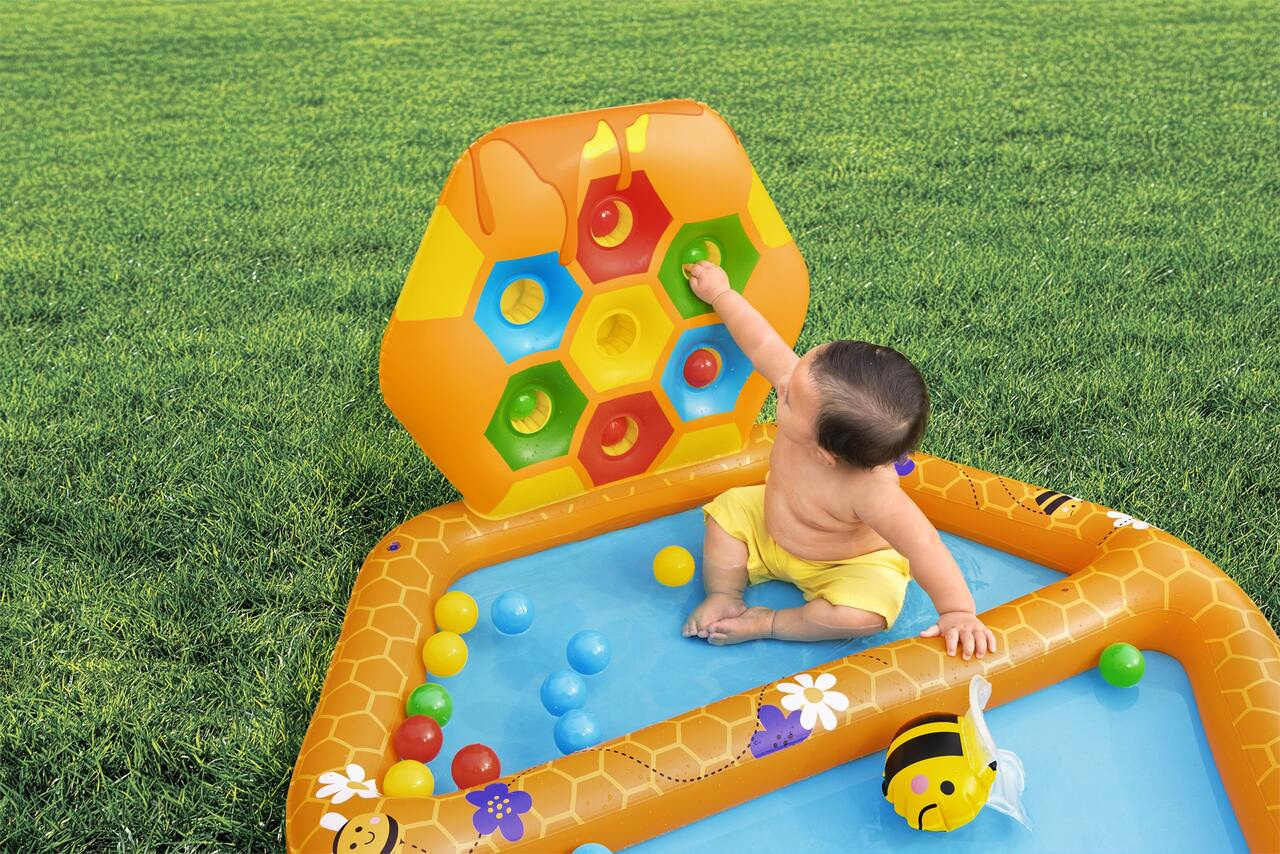 | - 2 nafukovací komory, - nafukovací herní deska, - měkká nafukovací podlaha, - doporučená náplň: 26 l, - 20 míčků a dvě nafukovací včely, - robustní, snadno ovladatelné ventily. | |
