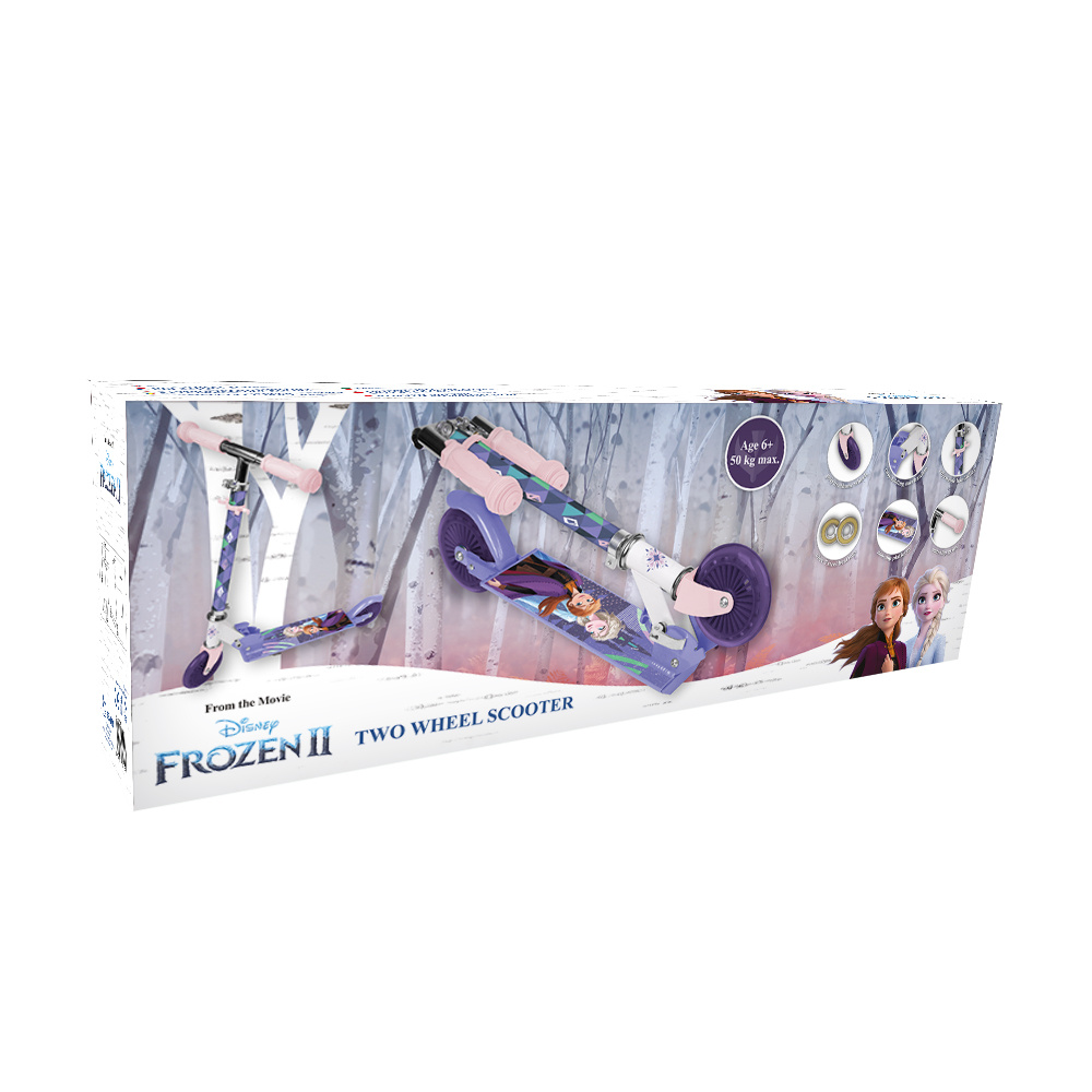 Dvoukolová koloběžka je ideální pro venkovní hry. Barevné postavičky z Disneyho kreslených filmů udělají řízení pro vaše dítě zábavné. Velký rozsah nastavení řídítek usnadňuje jízdu na koloběžce větším i menším dětem. Gumové úchyty zvyšují pohodlí, platforma je zesílena protiskluzovým materiálem chránícím proti uklouznutí. Polyuretanová kolečka (tvrdost 80A) zvyšují odpružení při jízdě na nerovných površích a vysoce kvalitní ložiska ABEC-7 zajišťují plynulou jízdu. Koloběžka má nožní brzdu pro zvýšenou bezpečnost a snadný, pohodlný skládací systém.