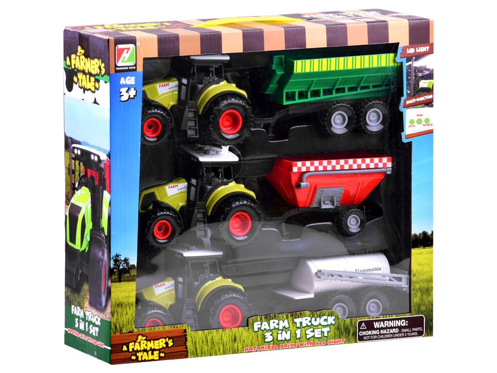 Farmářská sada tří traktorů s přívěsy, hračka se zvukem a světlemCelý popis