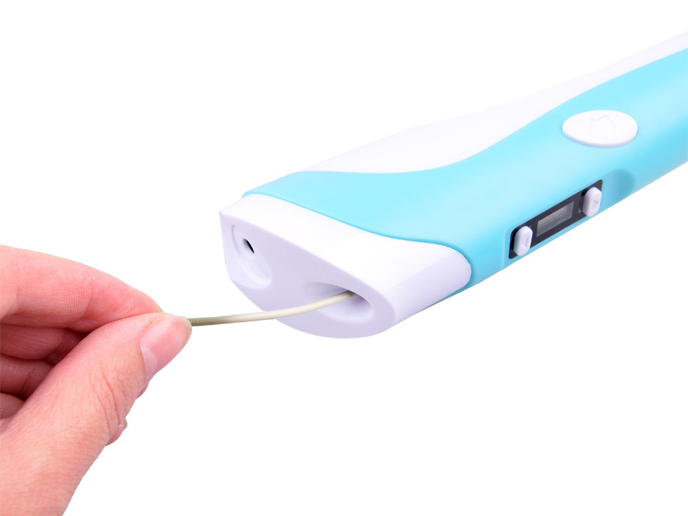 Když je pero připraveno k použití, změní se barva kontrolky LED umístěné na zařízení. Pak stačí vložit vlákno pera do určeného otvoru a můžeme začít tvořit.