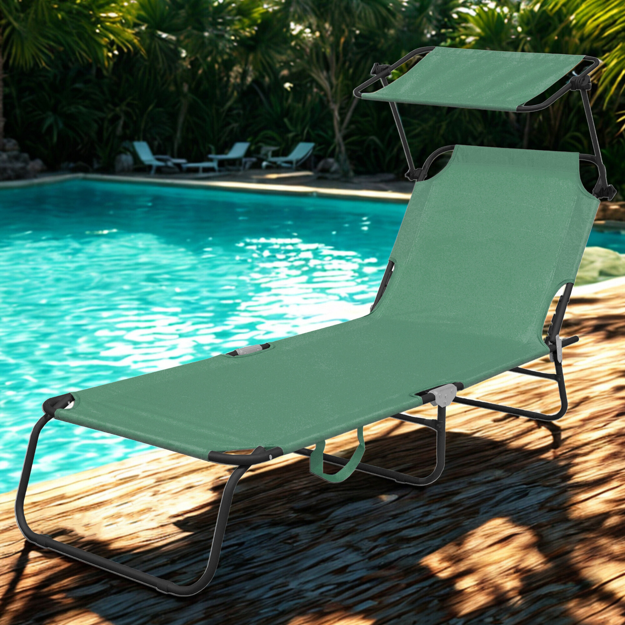 Skládací zahradní lehátko se zpevněnou ocelovou konstrukcí, v moderním designu, vhodné pro zahrady, na kempování či pláže.