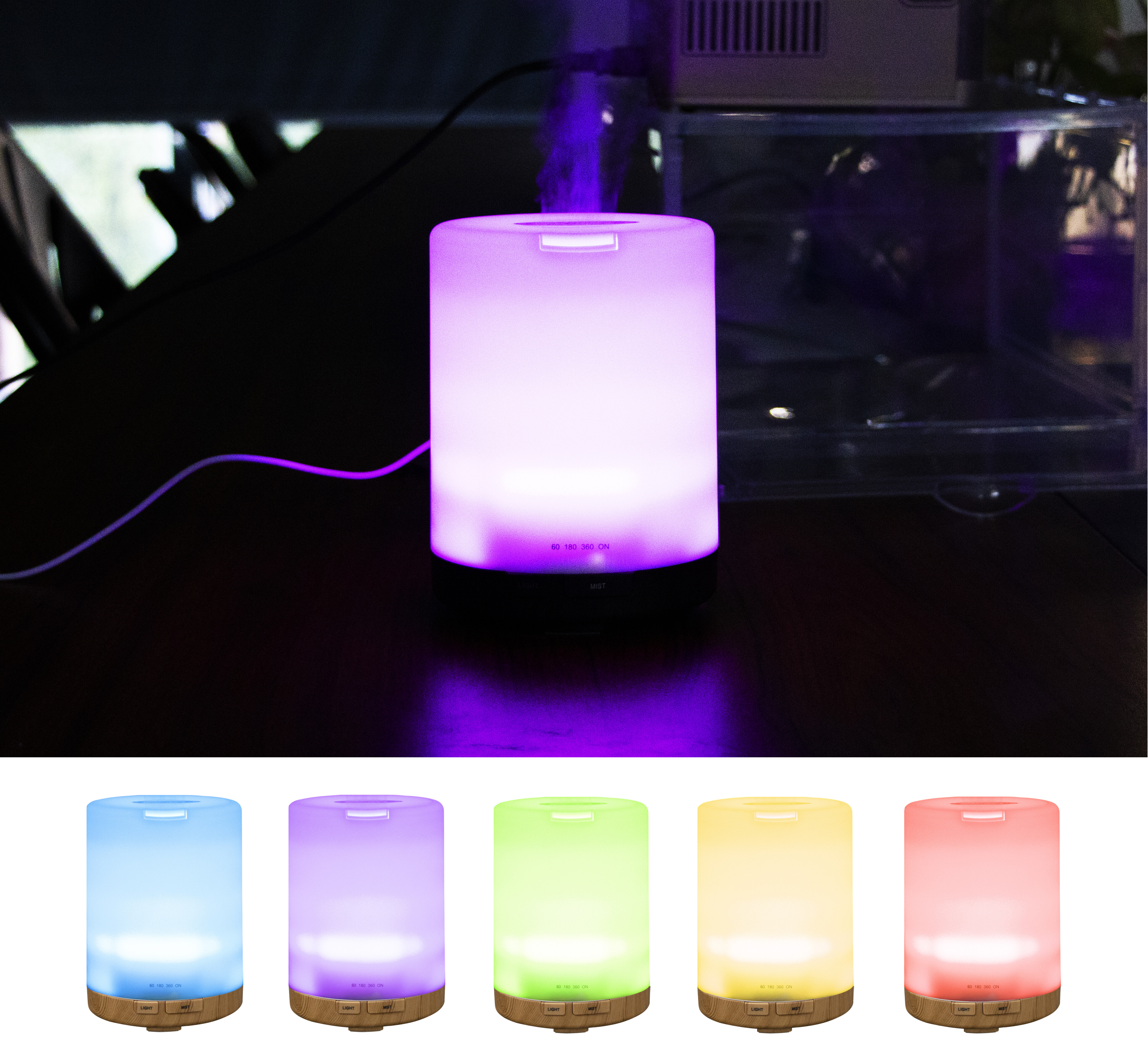 Difuzér je doplněn o barevné LED osvětlení, které nabízí až sedm různých barev.