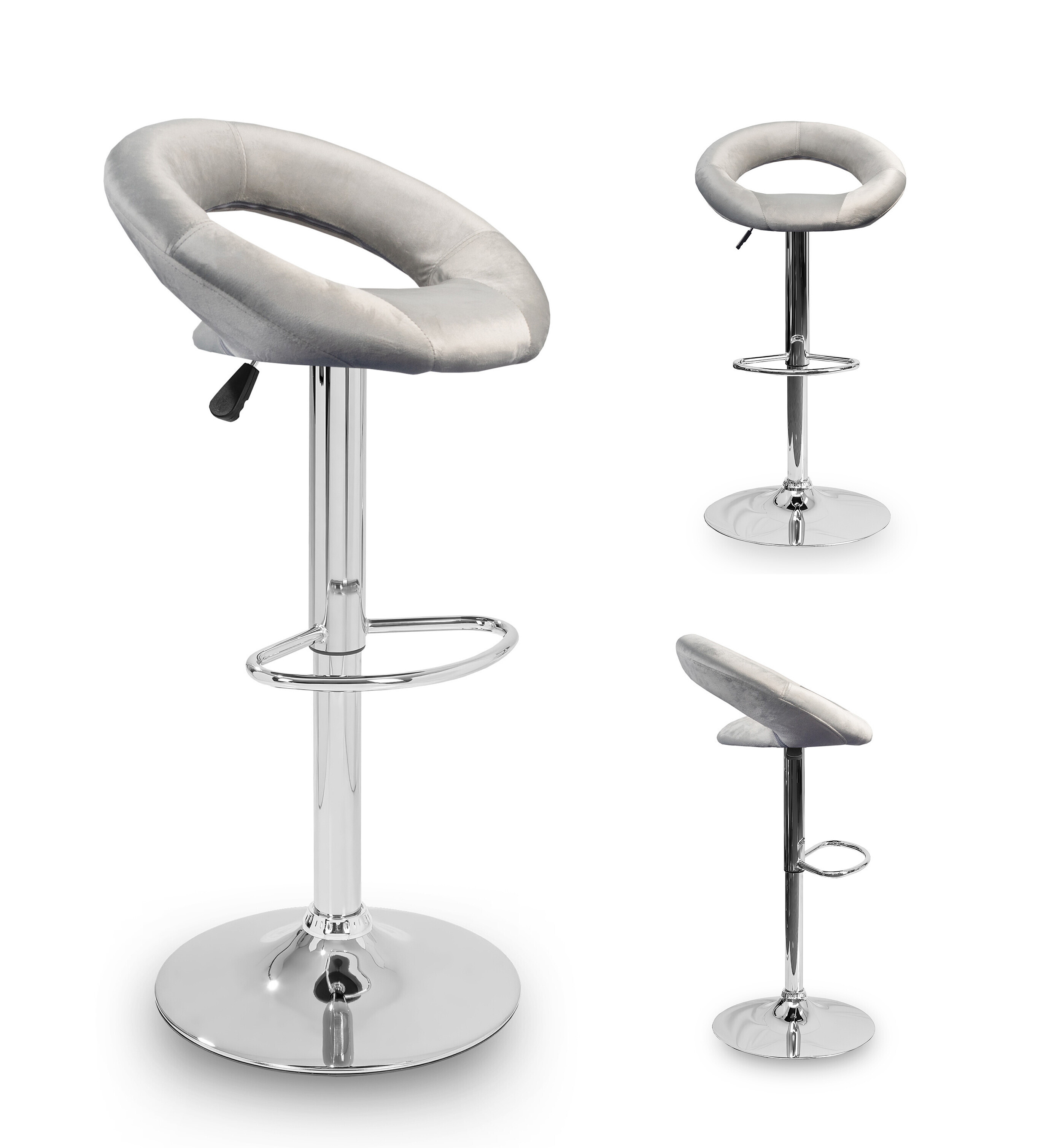 Židle vyniká kruhovými tvary, kruhový sedák spojený s kruhovým opěrákem. Povrch sedací části barové židle je ze sametu.