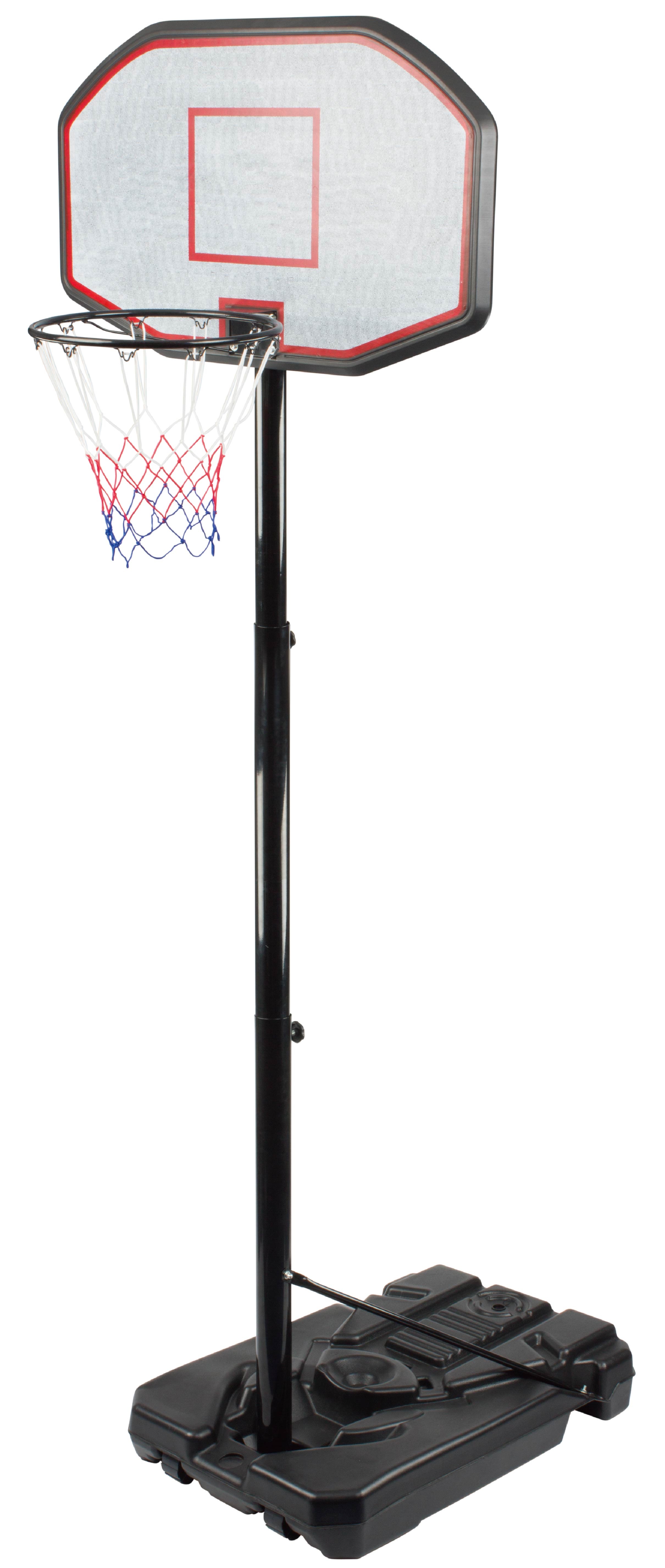 Mobilní basketbalový koš s nastavitelnou výškou, pevnou plastovou deskou a obroučkou se sítí.