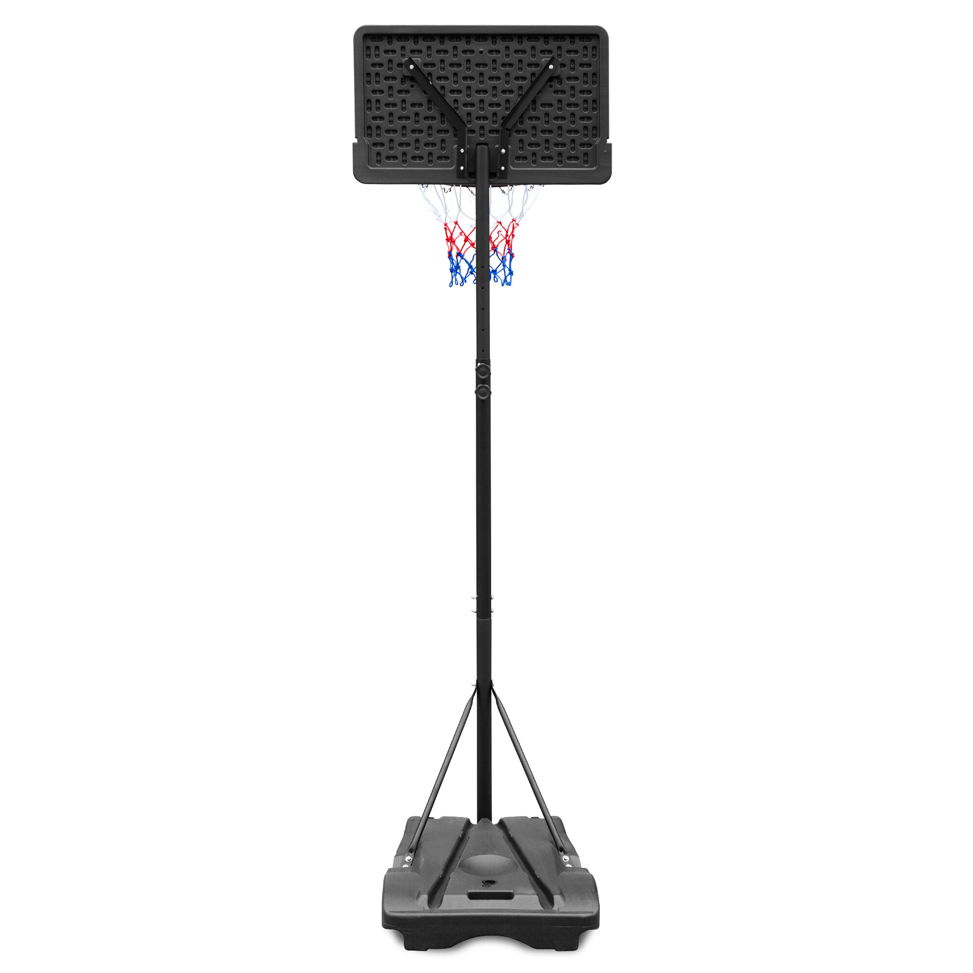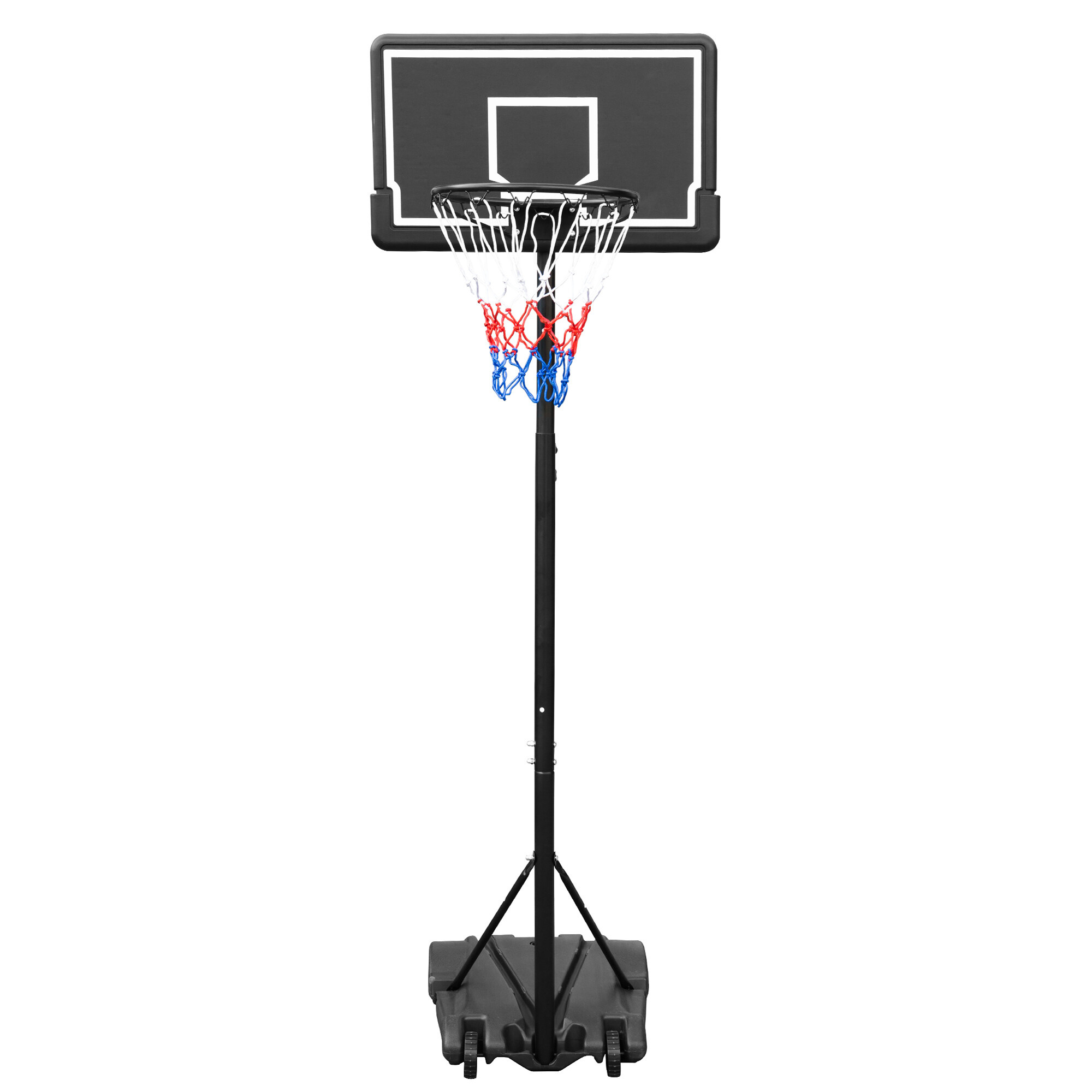 Mobilní basketbalový koš s nastavitelnou výškou, pevnou plastovou deskou a obroučkou se sítí.
