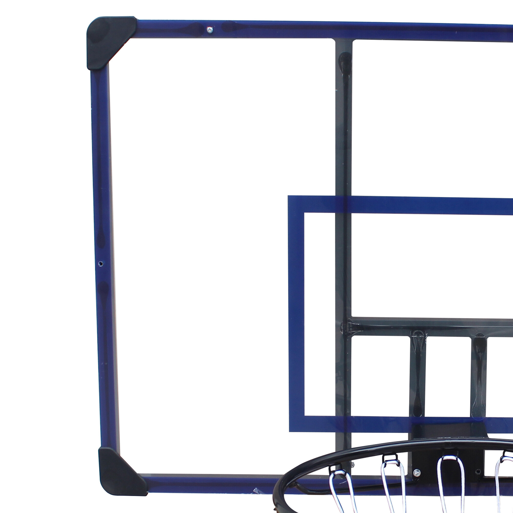 Na odrazové desce s modrými čarami je upevněn basketbalový koš s ocelovou obroučkou o průměru 45 cm lakovanou práškovým lakem a se síťkou odolnou proti povětrnostním vlivům.