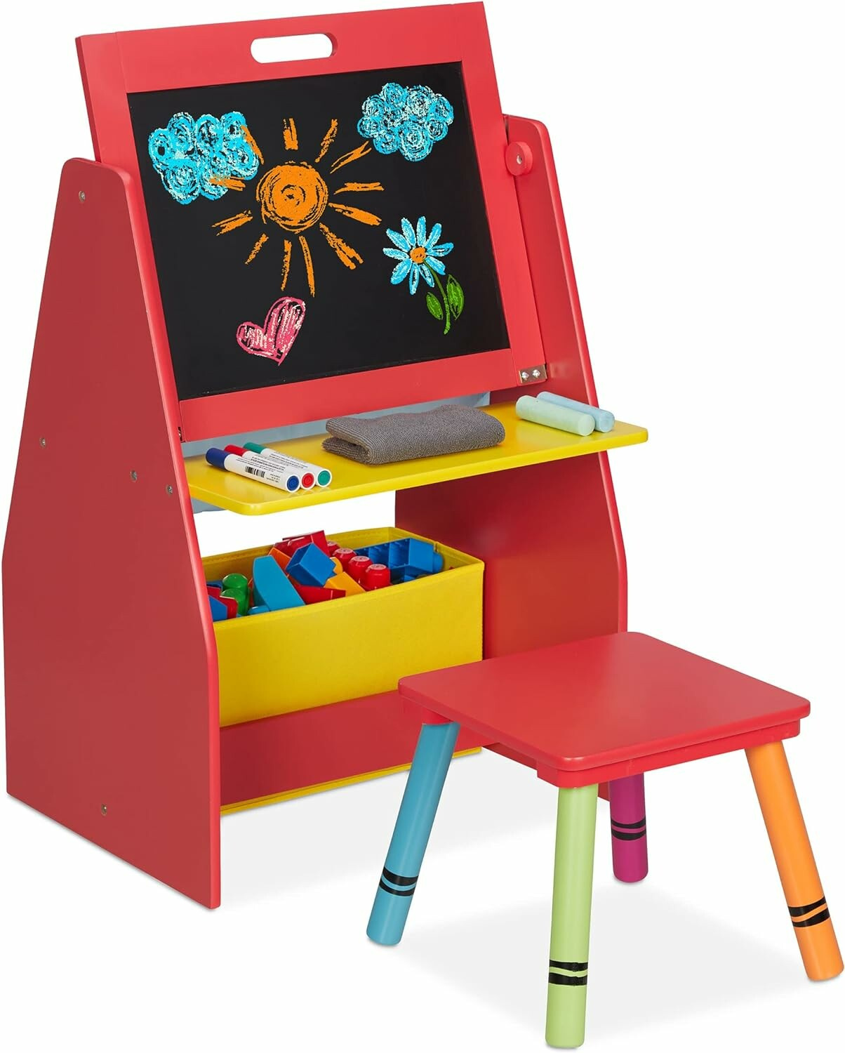Na jedné straně má povrch klasické křídové tabule, druhá strana tabule je magnetická. Pod tabulí je látkový koš, kde můžete uložit všechny oblíbené hračky.