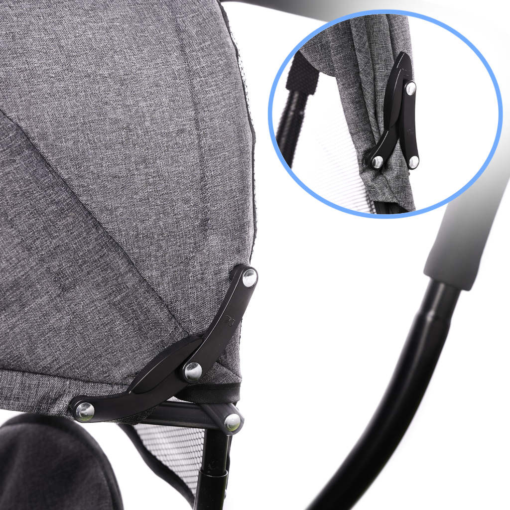 Kolo bylo vybaveno skládací, 3stupňovou stříškou se síťkou, chránící před sluncem a deštěm (lze ji demontovat). Složenou stříšku snadno zajistíš pomocí spony.