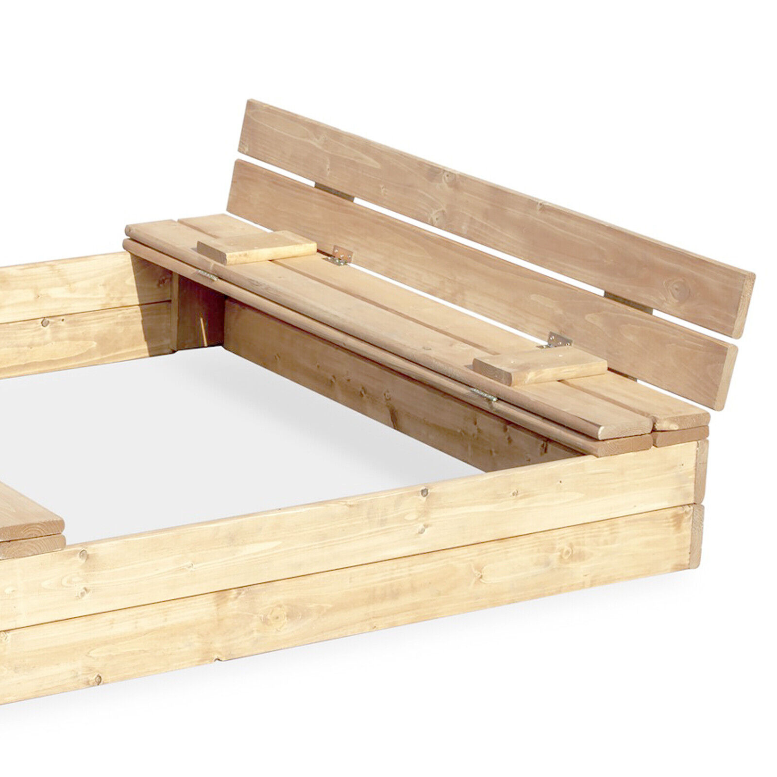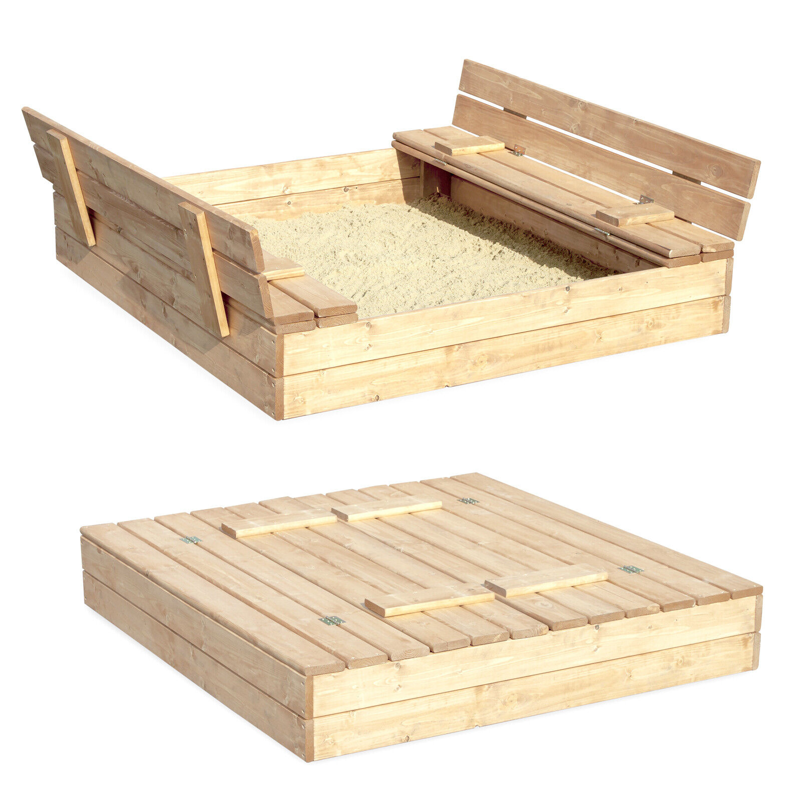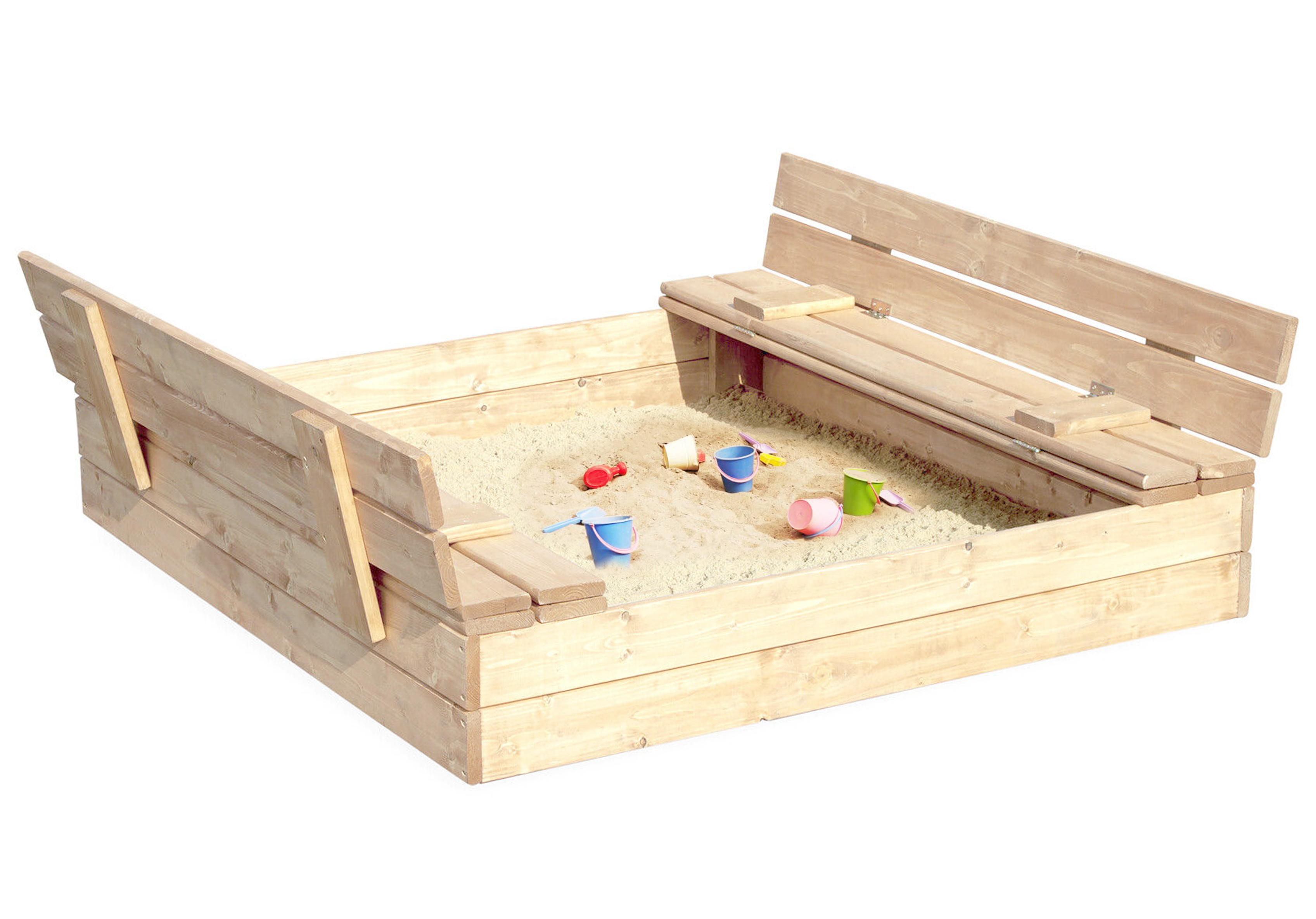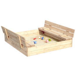 Pískoviště je vyrobeno z 20 mm smrkových desek. Má praktický poklop, který chrání písek proti nečistotám.