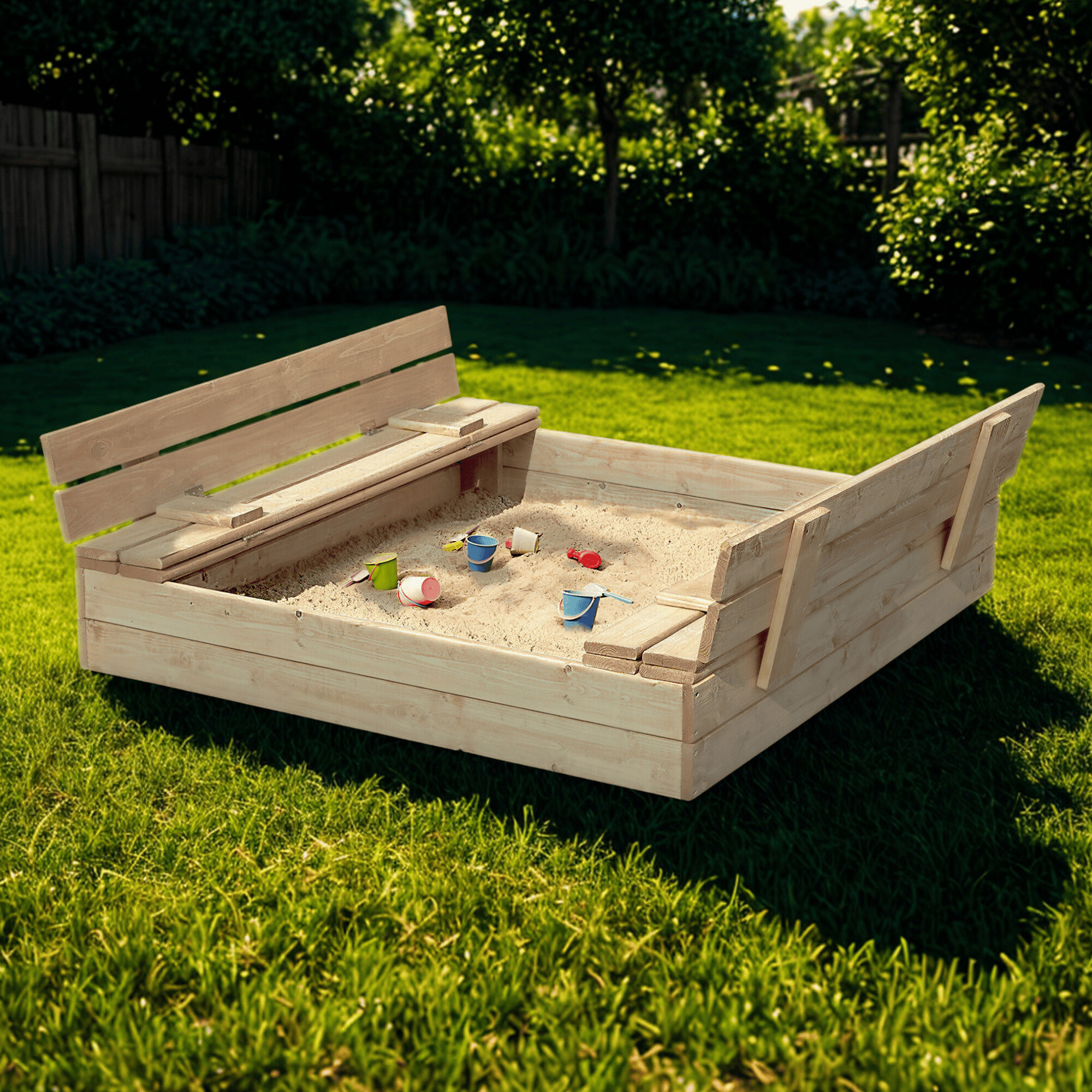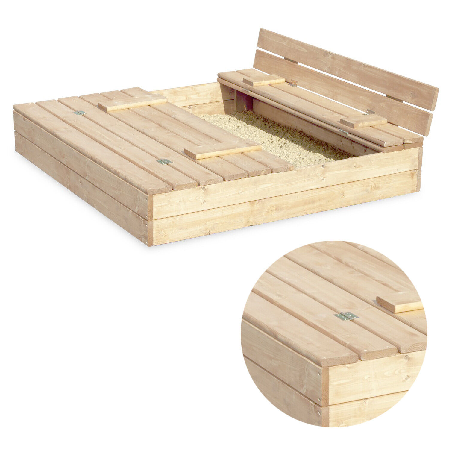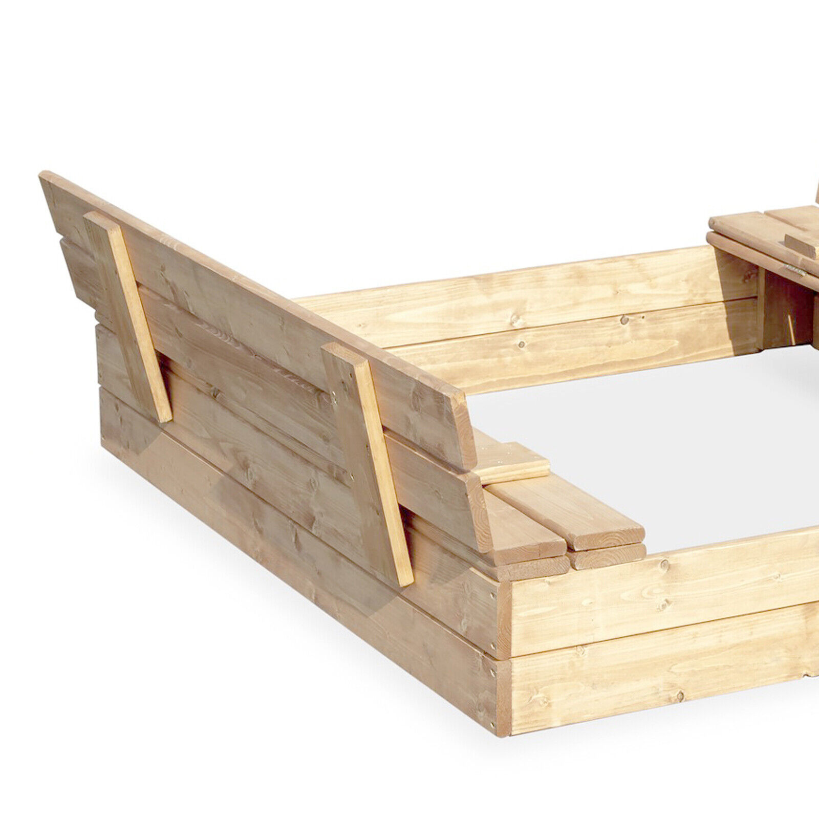 Pískoviště je vyrobeno z 20 mm smrkových desek. Má praktický poklop, který chrání písek proti nečistotám.