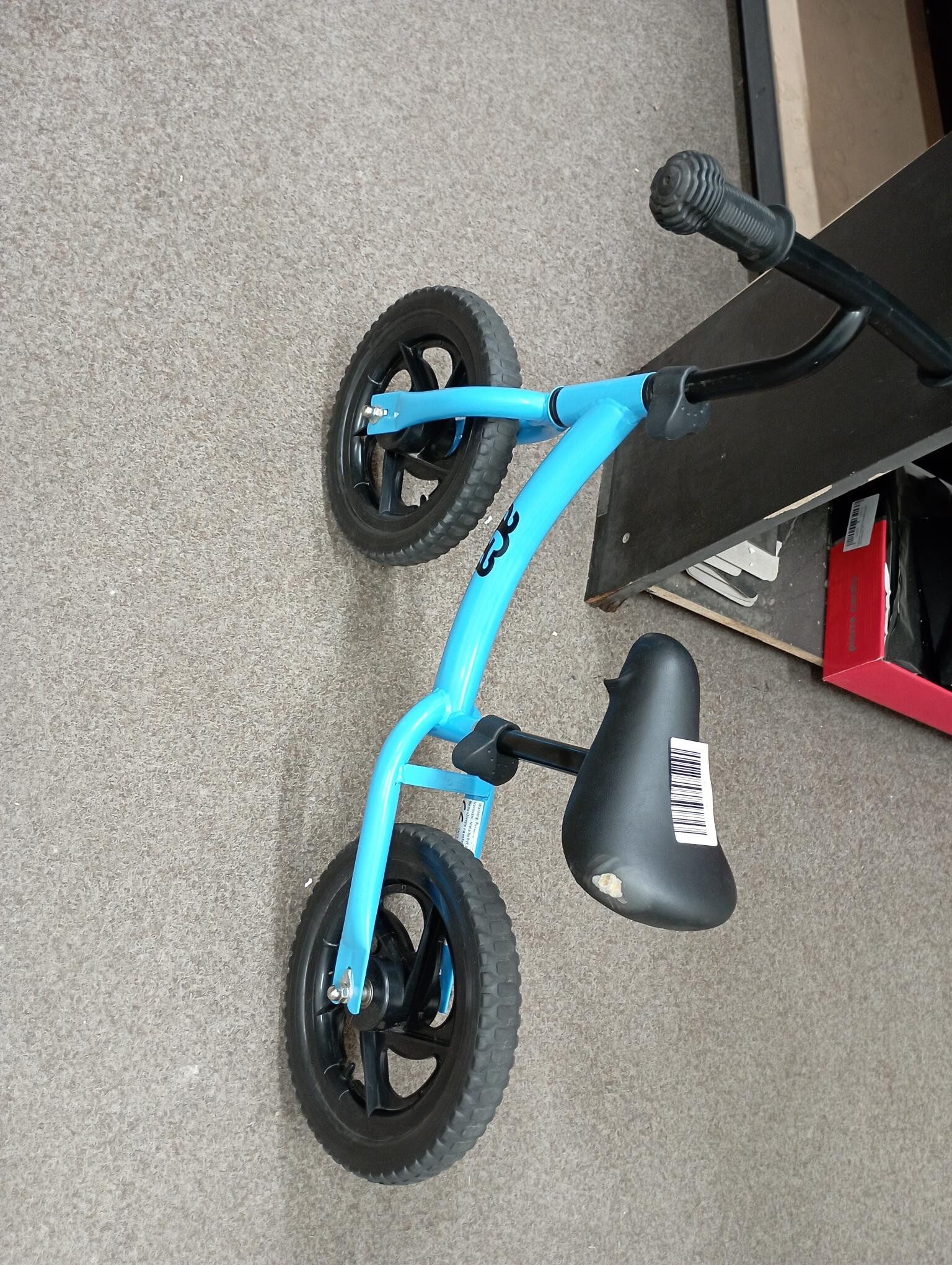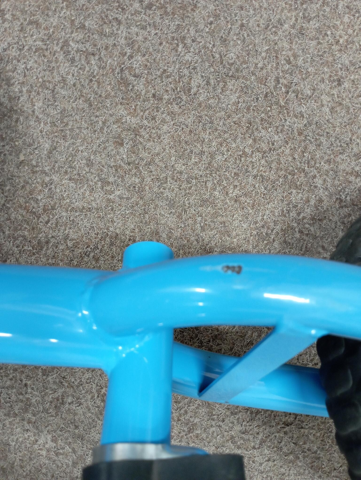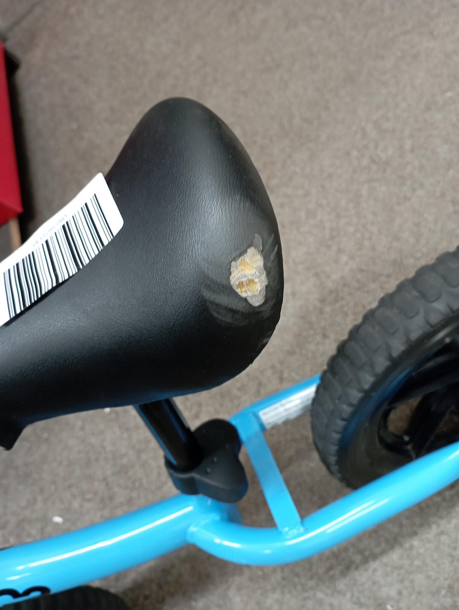 Odrážedlo je kompletní a plně funkční. Sedátko má díru, na konstrukci jsou drobné oděrky a celý výrobek je mírně zaprášený z uskladnění. Tyto vady jsou čistě vzhledového charakteru a neomezují možnost používání.