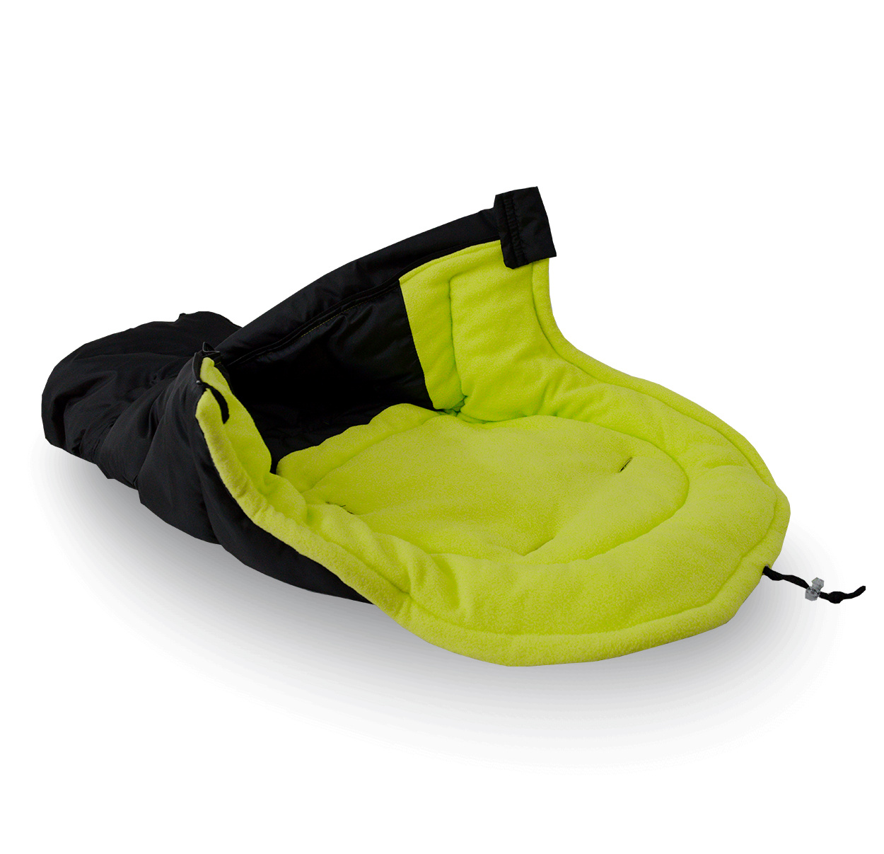 Dětský fusak má rozepínací zip, otvory na 5-bodové bezpečnostní pásy a gumové úchytky umožňující připevnění ke kočárku.