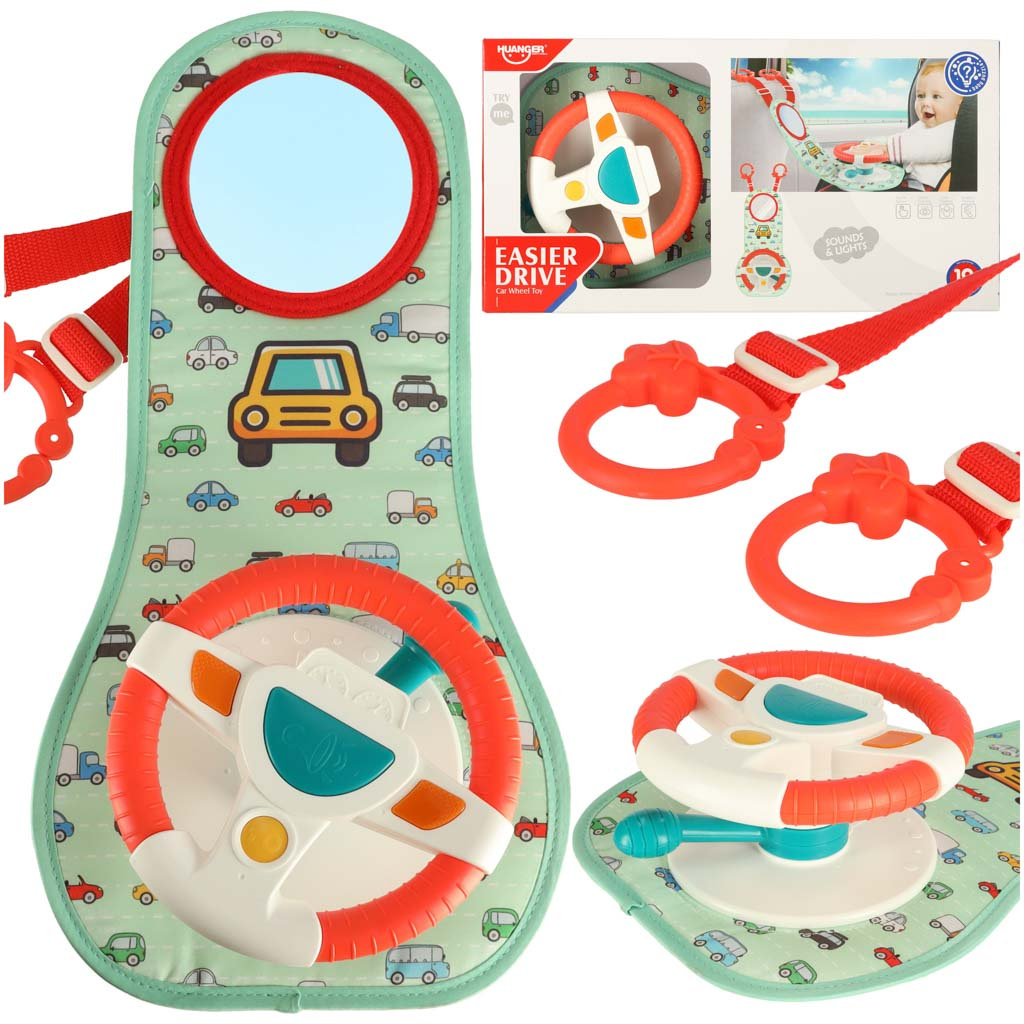 Rozjívené nebo plačící dítě na zadním sedadle je pro řidiče vozidla velkým stresem. Máme pro vás řešení, které vašemu batoleti zpříjemní cestu a zajistí hladkou jízdu. Interaktivní volant je typ manipulační desky, která úspěšně zaměstná malé ruce po celou dobu jízdy. Skládá se z volantu se 4 tlačítky, senzorické rukojeti a plastového bezpečnostního zrcátka. Kusy jsou umístěny na pevné podložce potažené příjemnou látkou s motivem autíček.