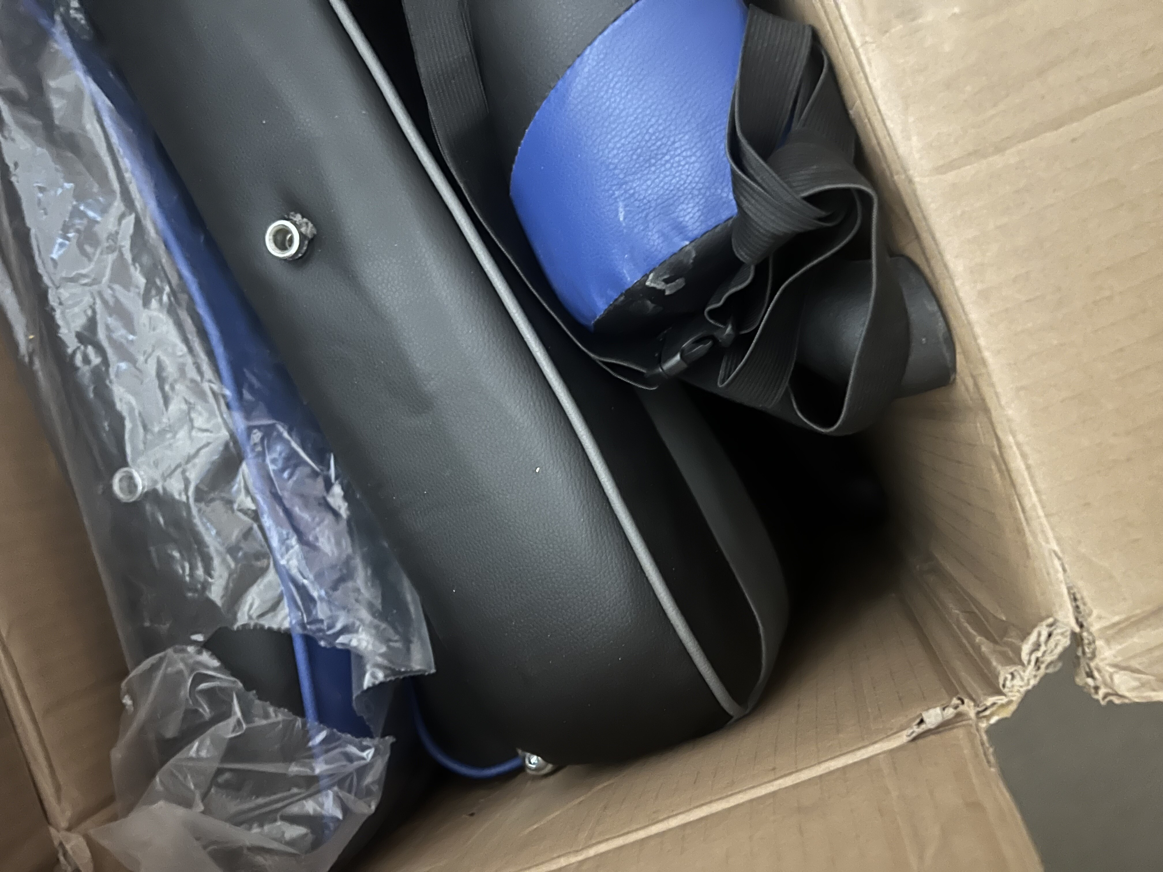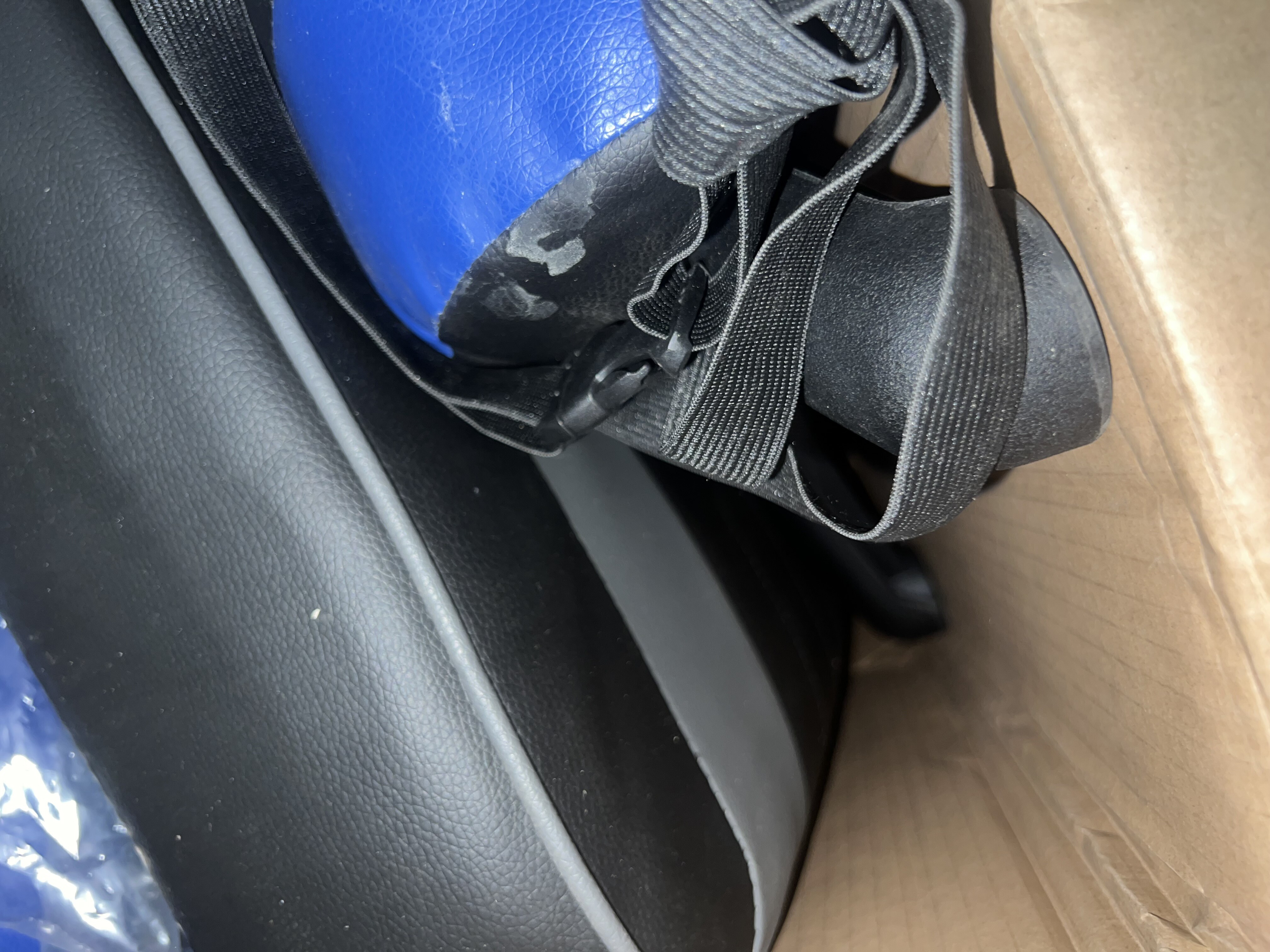 Židle složená ze dvou různých barev (modrá a šedá)jednoho modelu, mírně zaprášená, špinavá.