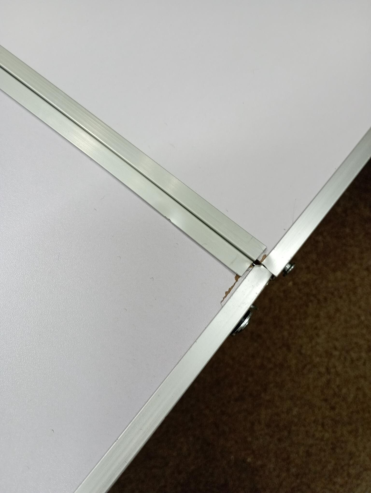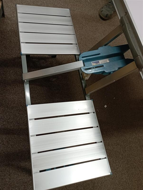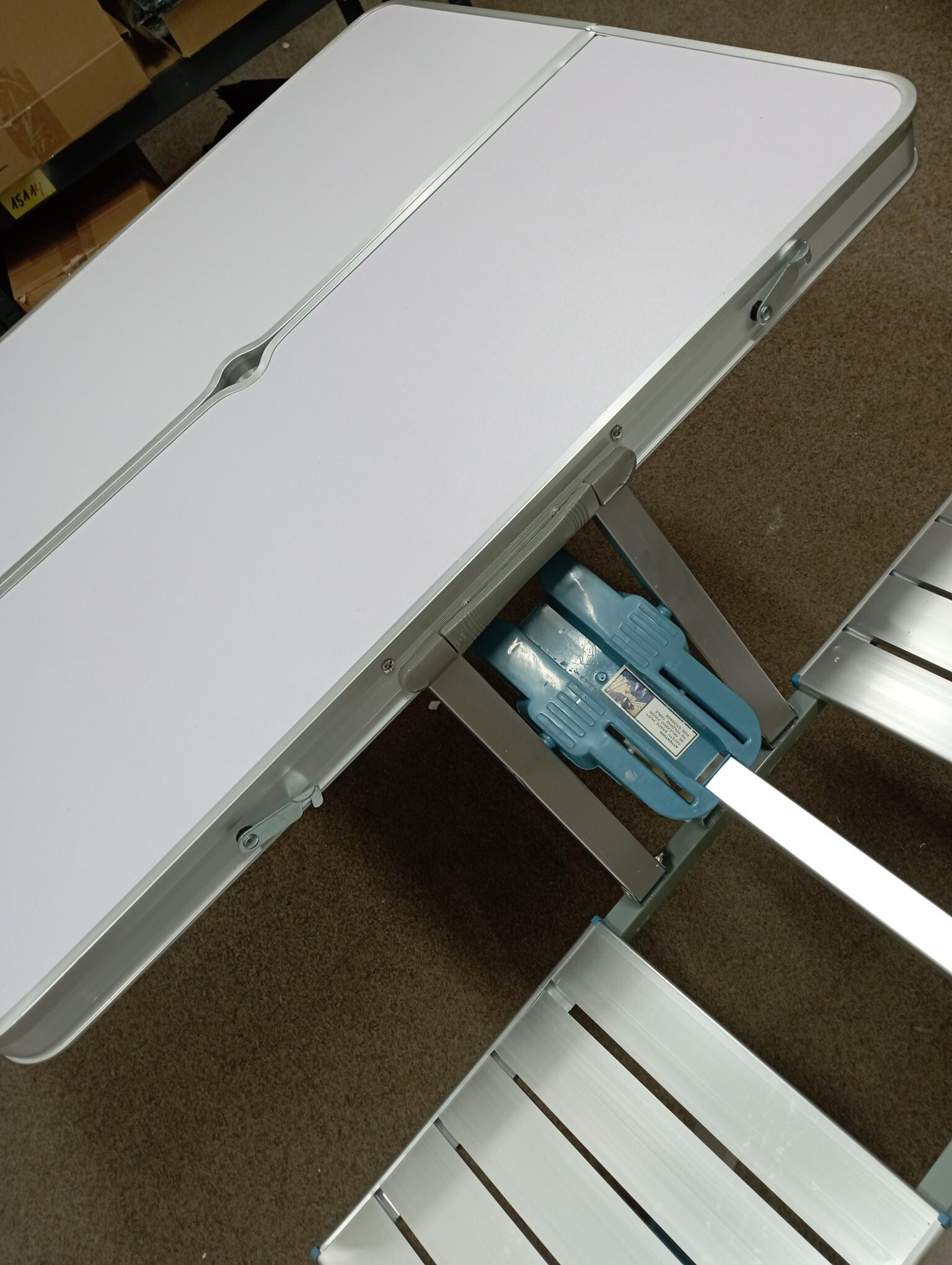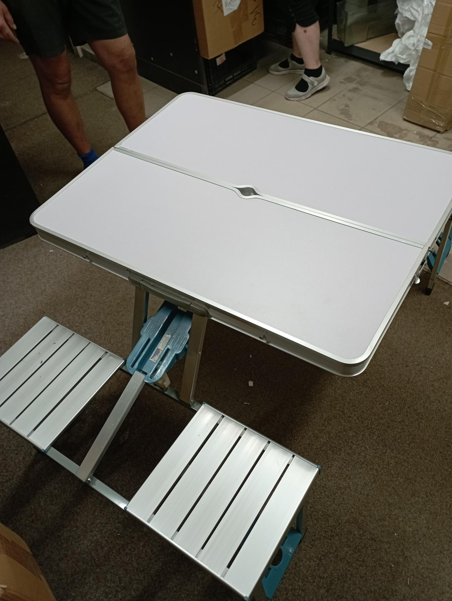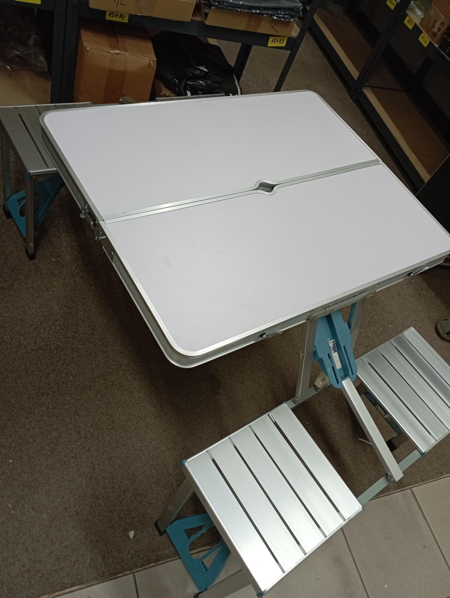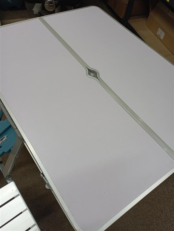 Tento set byl rozbalený a nese drobné známky manipulace. Stůl má na boční straně odřenou barvu a hliníkový okraj je mírně zkřivený (viz fotografie).