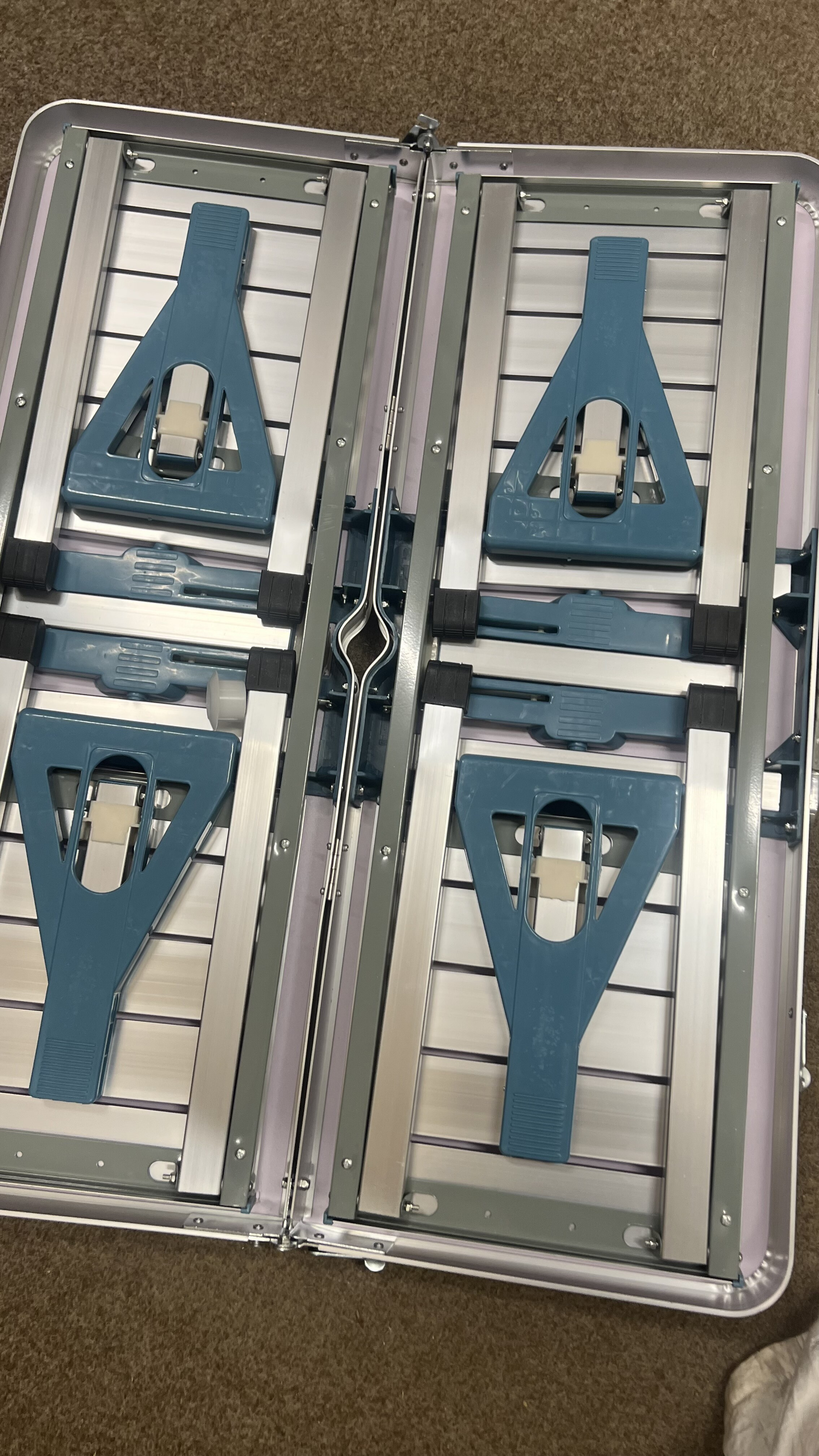 Kempingový skládací set je kompletní a plně funkční. Vada spočívá v prasklinách na desce ve dvou rozích, povrch je navíc místy lehce odřený a zaprášený.