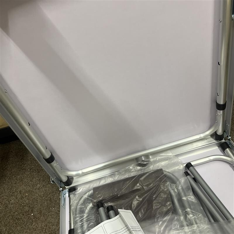 Kempingový stůl má na jedné straně poškození, je promáčklý.