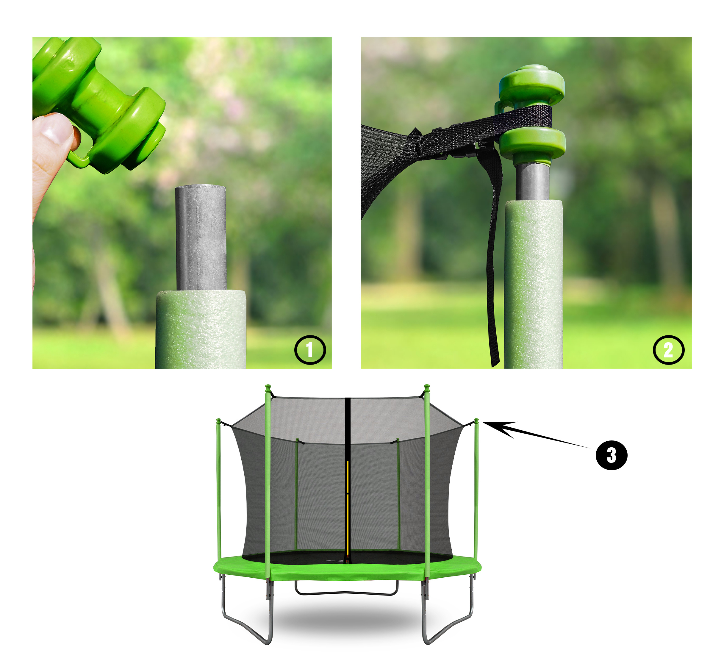 Klobouček se nasazuje na horní ochrannou tyč sítě trampolíny a jejím hlavním úkolem je zabránit zranění o ostrou hranu.
