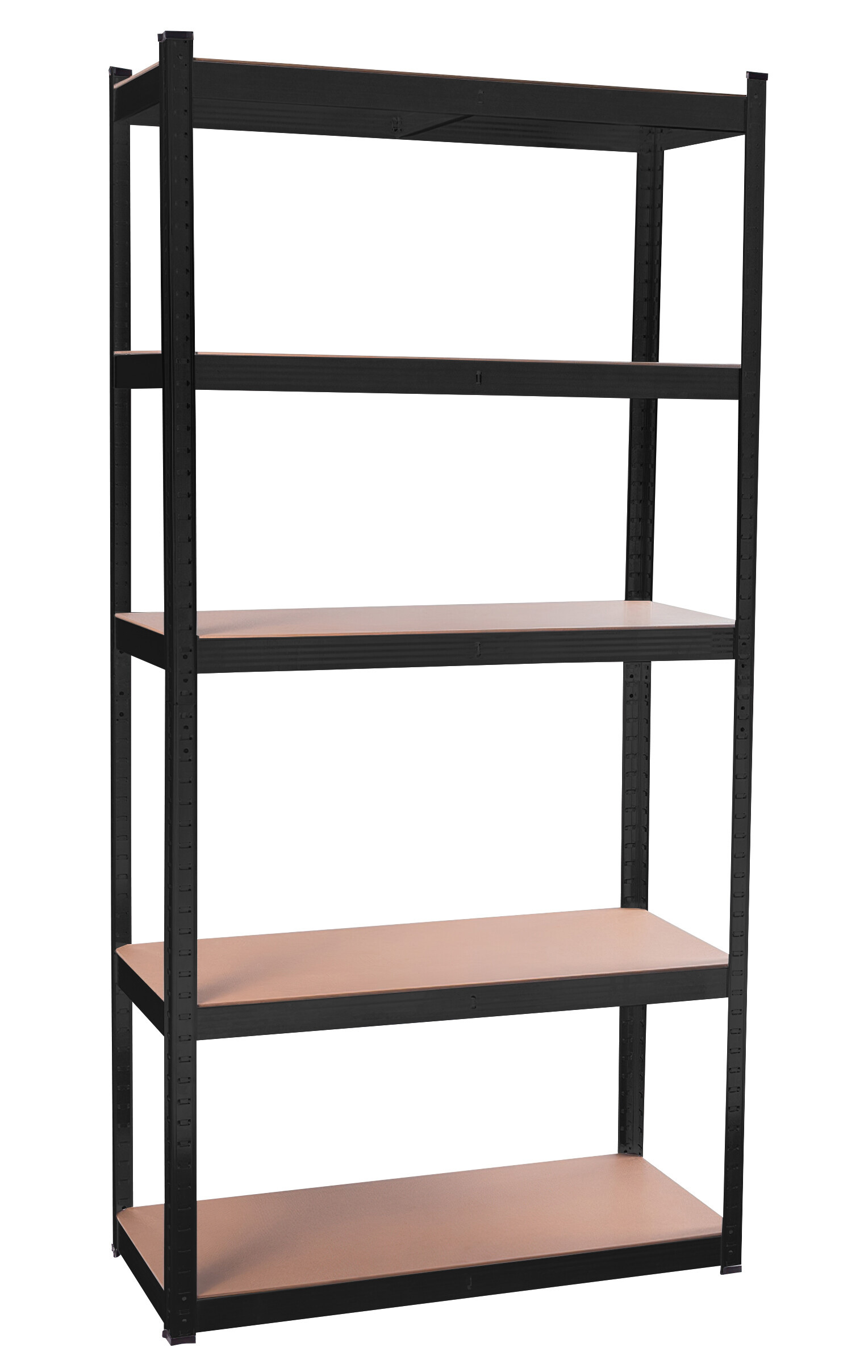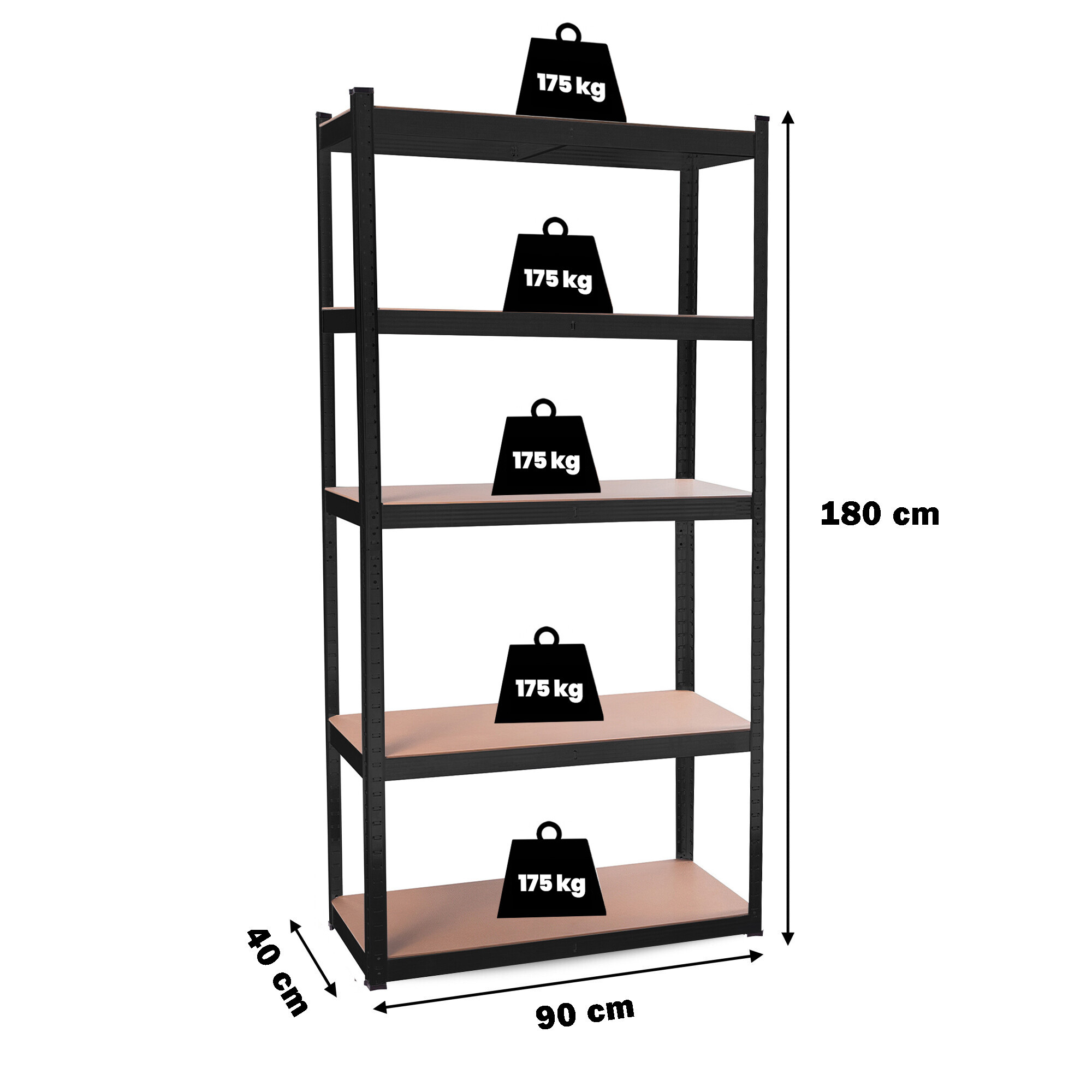 Na výšce cca 180 cm máte k dispozici 5 polic z mdf, které lze výškově vložit dle potřeby. Rám z galvanizované oceli v černé barvě zaručuje stabilitu a velkou nosnost cca 875 kg (na každou polici připadá cca 175 kg).