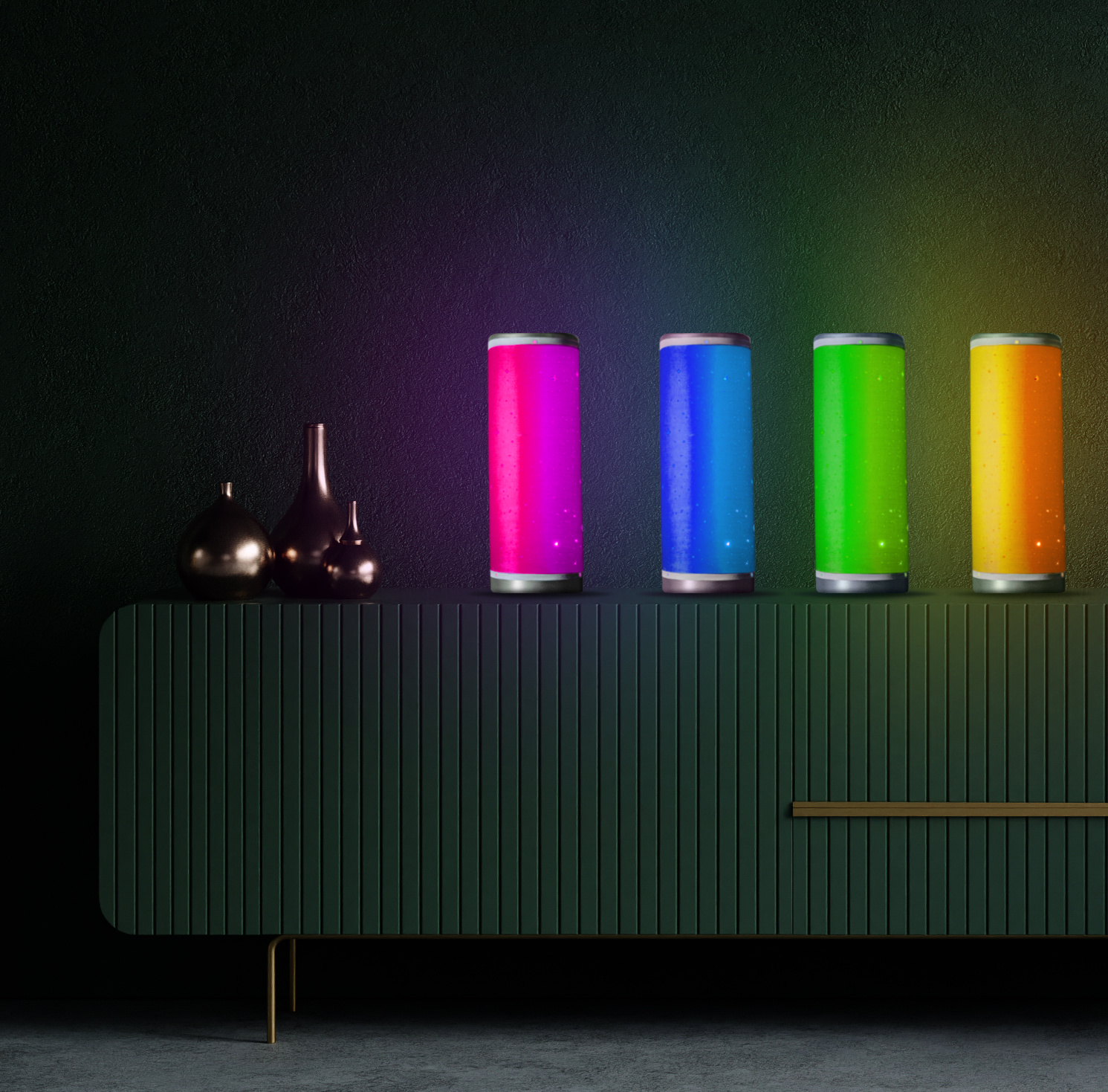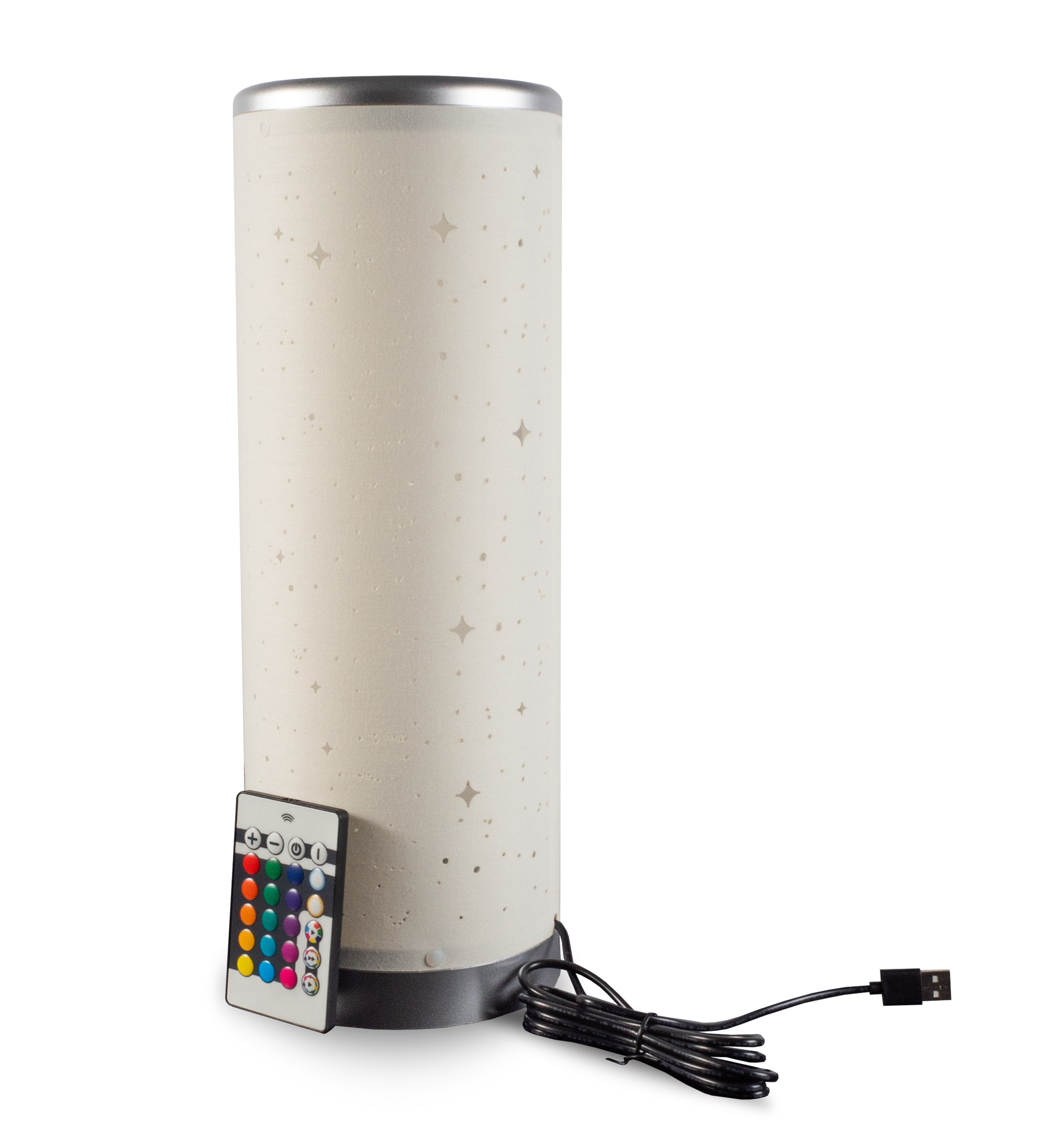 Lampička s hvězdným vzorem. Dálkové ovládání, které umožňuje řízení světelného zdroje. Díky tomu můžete nastavit na LED lampičce, aby svítila v bílé barvě nebo v jedné z 16 dostupných barev.