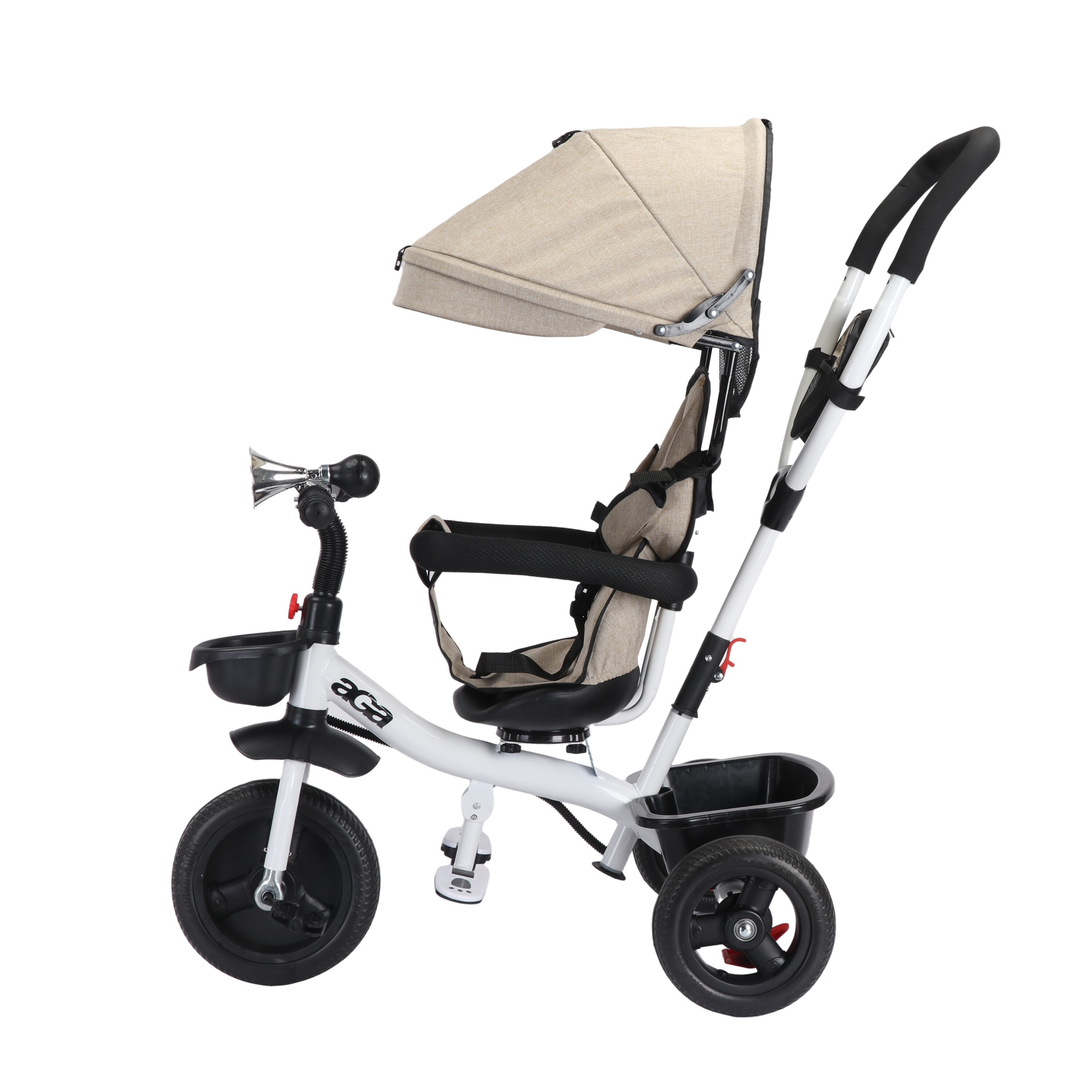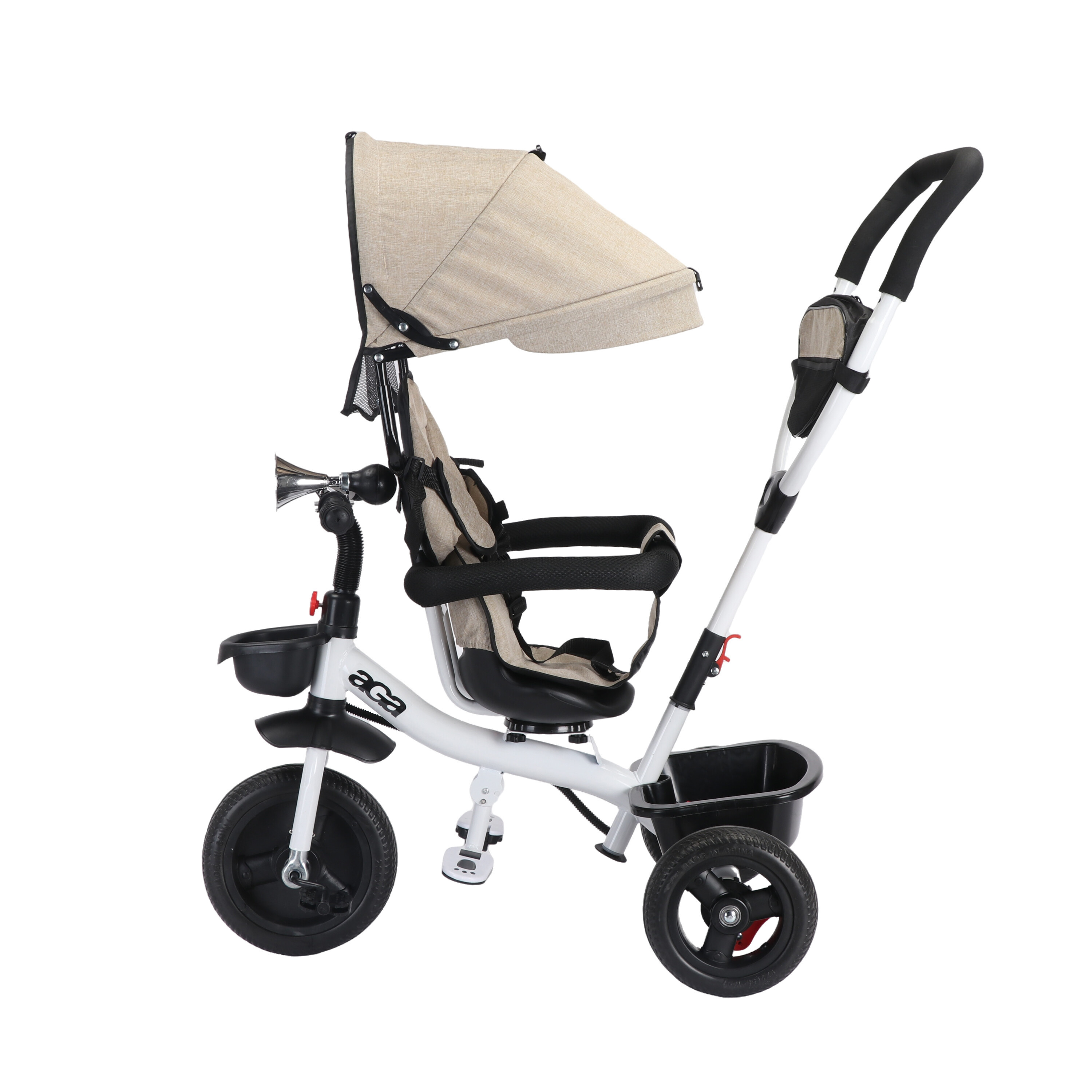 Sedadlo lze otočit o 360° a to ve směru jízdy nebo čelem k rodiči. V zadní a přední části tříkolky je umístěn odkládací košík.