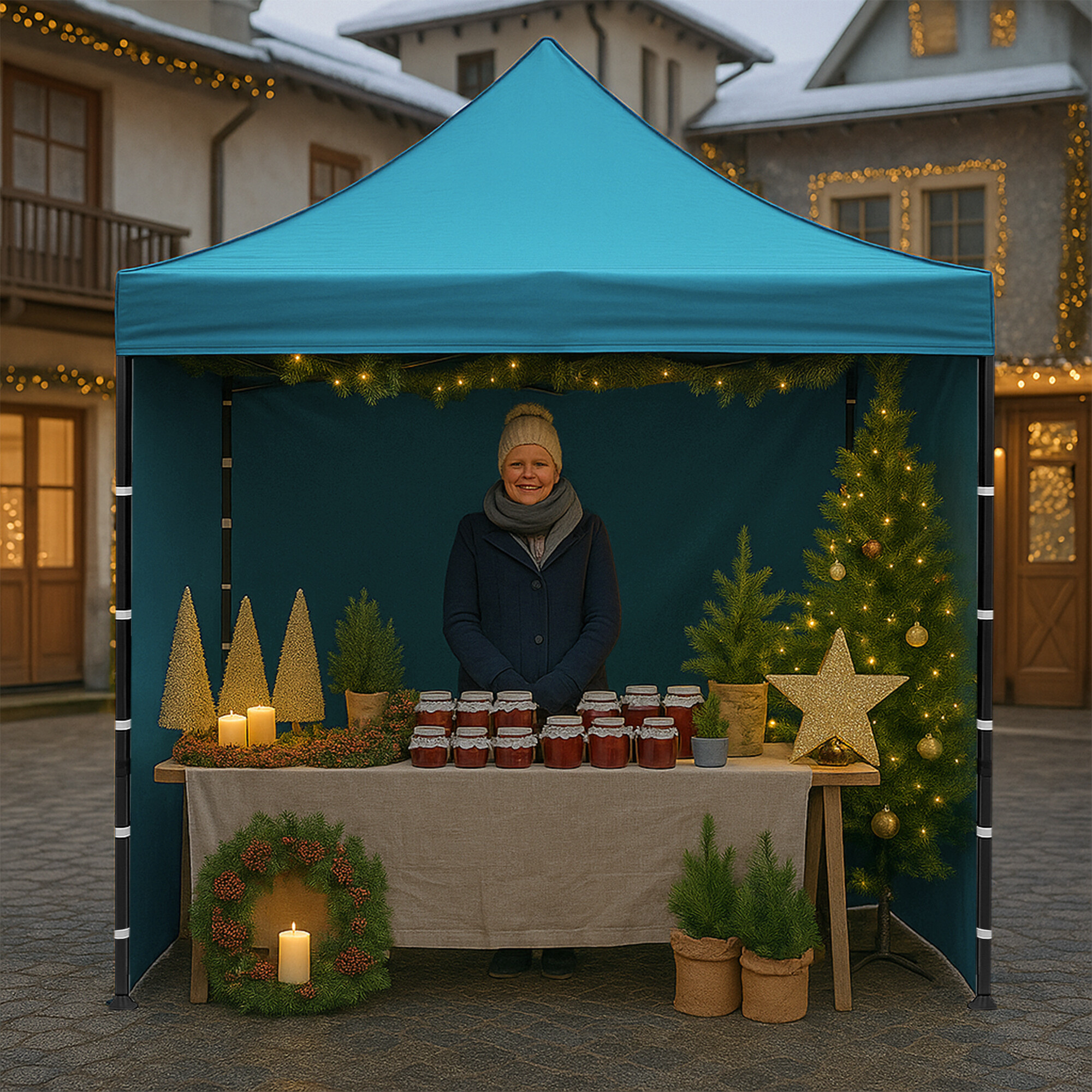 Prodejní stánek 3×3 m s pevnou nůžkovou ocelovou konstrukcí patří k nejvyhledávanějším modelům. Poskytuje dostatek prostoru pro prodej i prezentaci a zároveň se snadno přenáší a rychle skládá. Využijete ho při venkovních i interiérových akcích od farmářských trhů přes veletrhy a výstavy až po promo akce a firemní eventy.