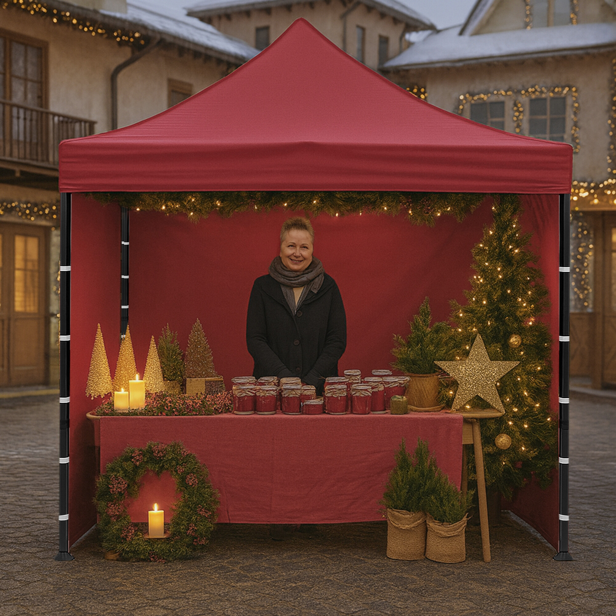 Prodejní stánek 3×3 m s pevnou nůžkovou ocelovou konstrukcí patří k nejvyhledávanějším modelům. Poskytuje dostatek prostoru pro prodej i prezentaci a zároveň se snadno přenáší a rychle skládá. Využijete ho při venkovních i interiérových akcích od farmářských trhů přes veletrhy a výstavy až po promo akce a firemní eventy.