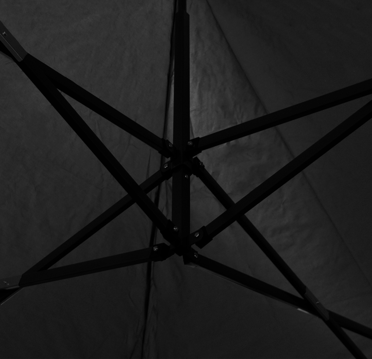 Konstrukce je vyrobena z práškově lakované oceli se šroubovanými spoji, které dodávají stánku stabilitu a pevnost i při častém používání. Patky na nohách umožňují bezpečné ukotvení k povrchu. Součástí provedení je také středová noha, která rovnoměrně rozkládá zatížení konstrukce, zvyšuje stabilitu a snižuje průhyb střechy u velkého rozměru 3×6 m.
