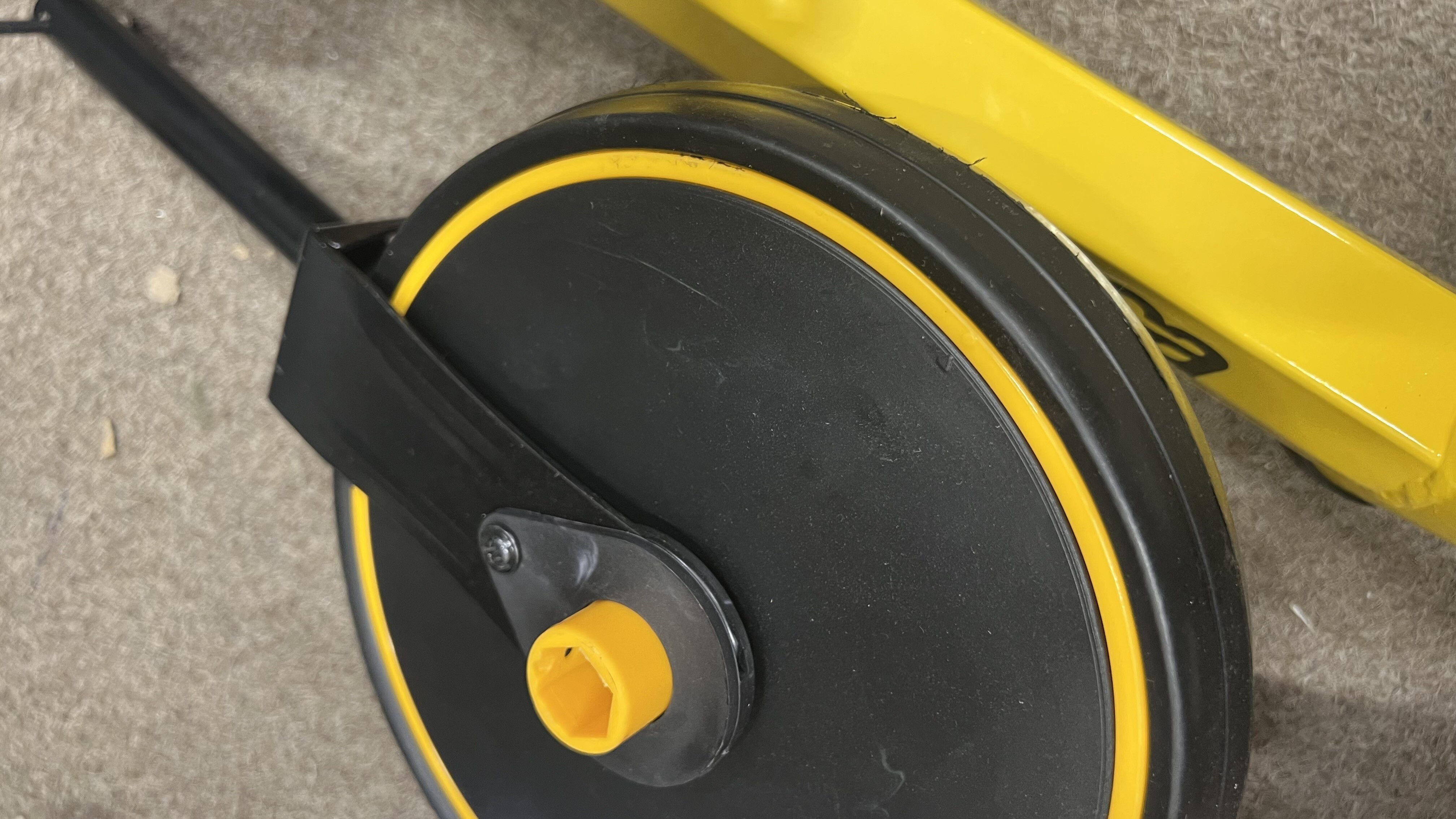 Odrážedlo má poškrábaný rám, sedátko je promáčklé.