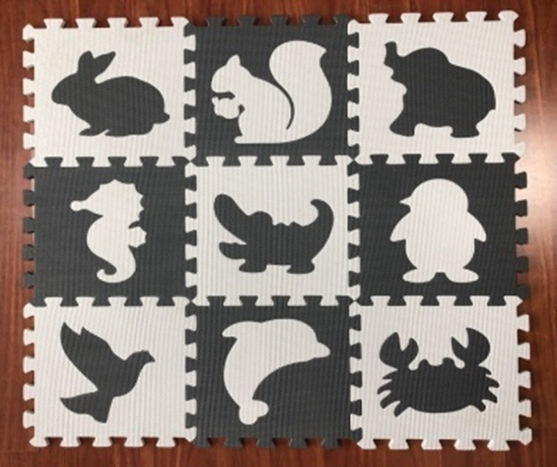 Kontrastní pěnové puzzle s obrázky zvířat a tvarů. Nejen že rozvinou zrak a motoriku miminka, ale postavit z nich můžete také ohrádku, a tím vytvořit bezpečný prostor k hraní.