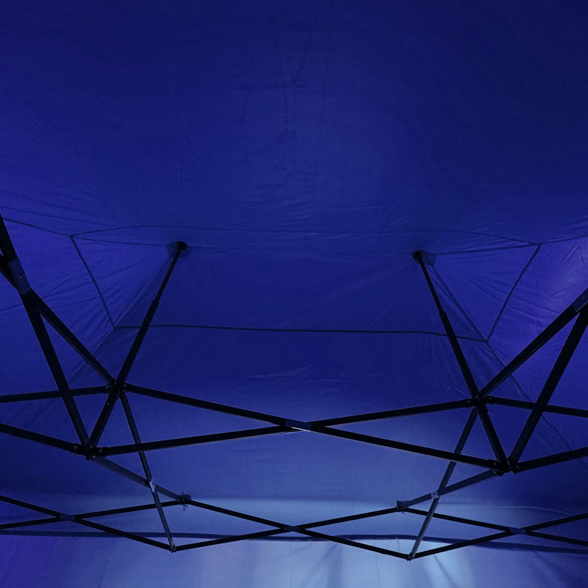 Nohy stánku jsou zakončeny patkami pro ukotvení do země, díky čemuž je konstrukce pevná a stabilní. Složení i rozložení zabere 5–10 minut a obejde se bez použití nářadí. Po skončení akce lze stánek uložit do praktického transportního vaku, který usnadňuje manipulaci a šetří místo při přepravě i skladování.