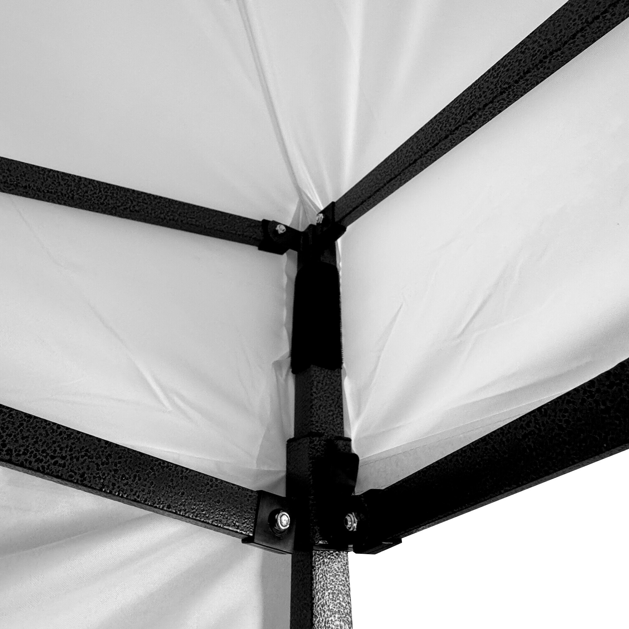 U tohoto modelu je navíc uprostřed konstrukce umístěna dodatečná středová noha, která poskytuje extra oporu celé ploše. Díky tomu je rám stabilní i při větší zátěži a zároveň se zamezuje prohýbání střechy na takto velké ploše. Každá noha je zakončena patkou s možností ukotvení do země, což výrazně zvyšuje celkovou stabilitu stánku i v náročnějších podmínkách.