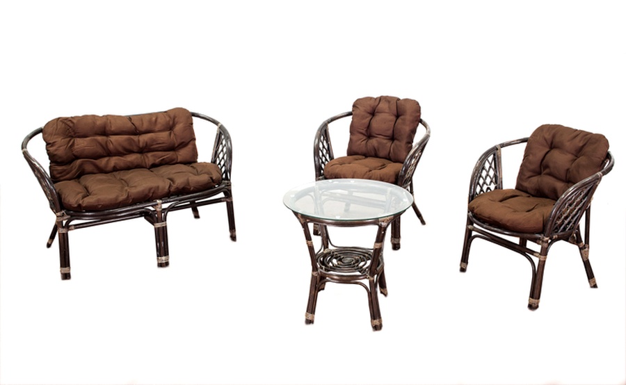 - Sestava obsahuje: Ratanovou lavici, 2 křesla, stolek se sklem a kompletní sadu polstrů