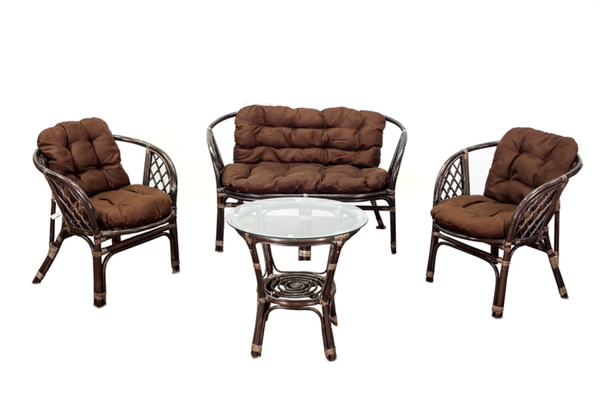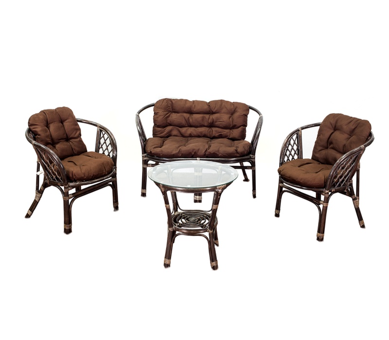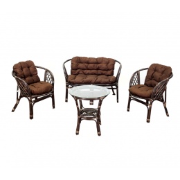 Kolekce obsahuje 2 ratanová křesla, ratanovou lavici a ratanový stolek se skleněnou deskou. Stolek má ve spodní části plochu na ukládání drobných věcí.