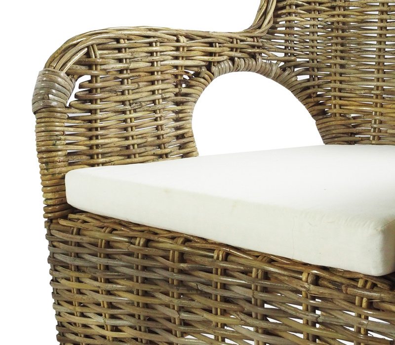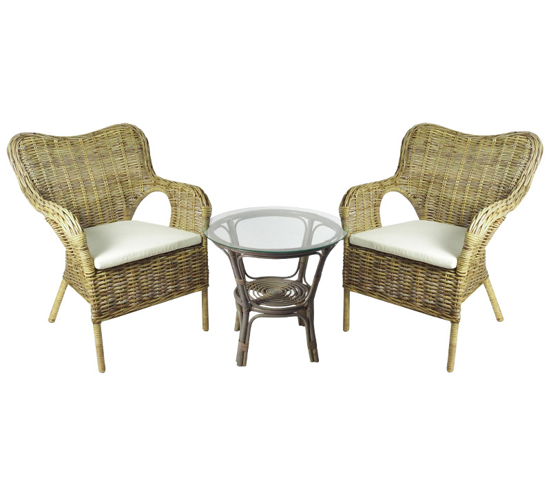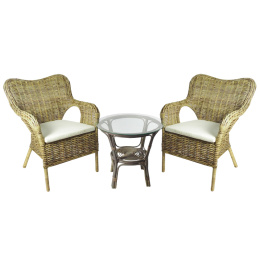 Kolekce obsahuje 2 ratanová křesla s ratanvým výpletem a ratanový stolek se skleněnou deskou. Stolek má ve spodní části plochu na ukládání drobných věcí.