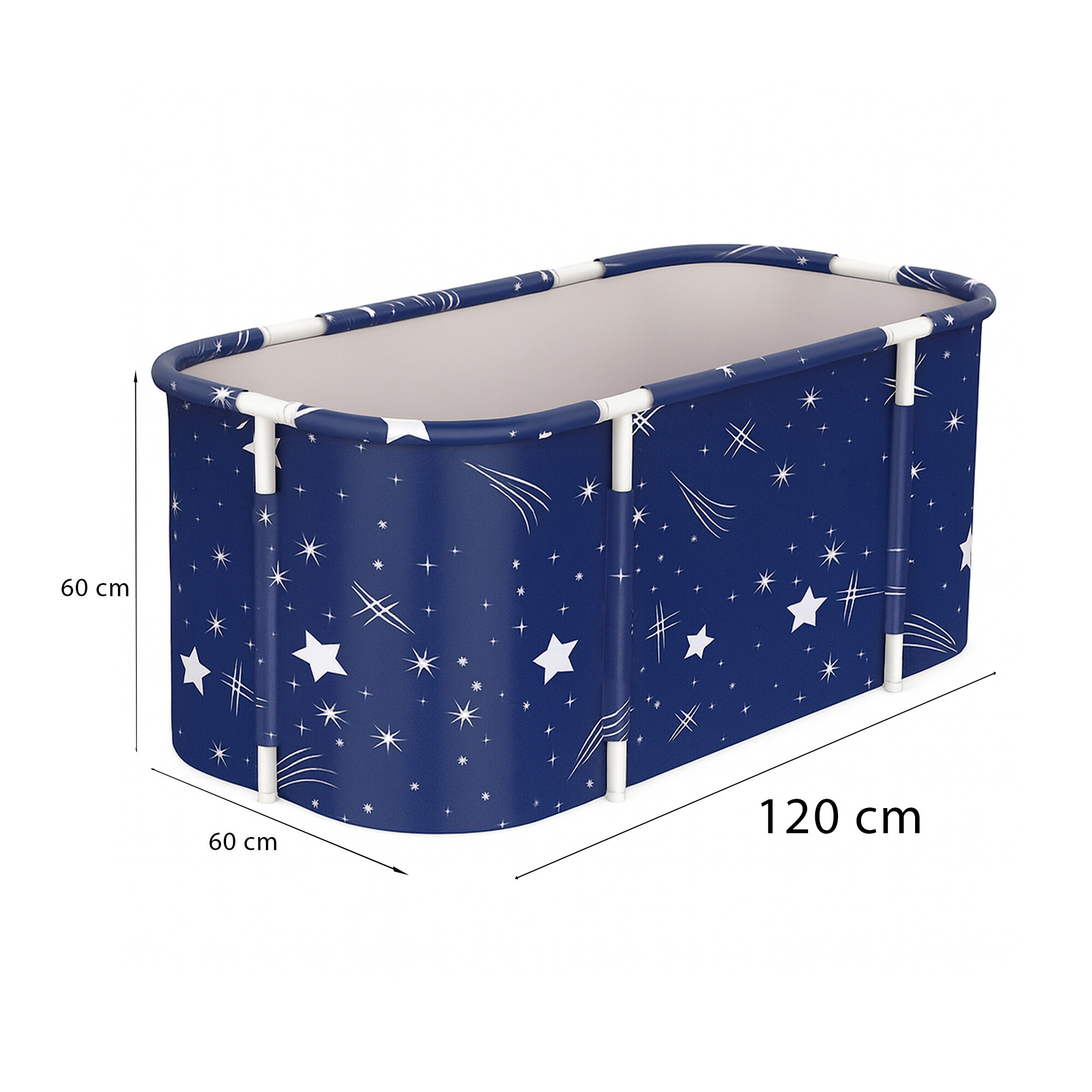 Skládací přenosná vana má rozměry 120 × 60 × 60 cm, takže nabízí dostatek prostoru pro pohodlnou koupel i v menších domácnostech.
