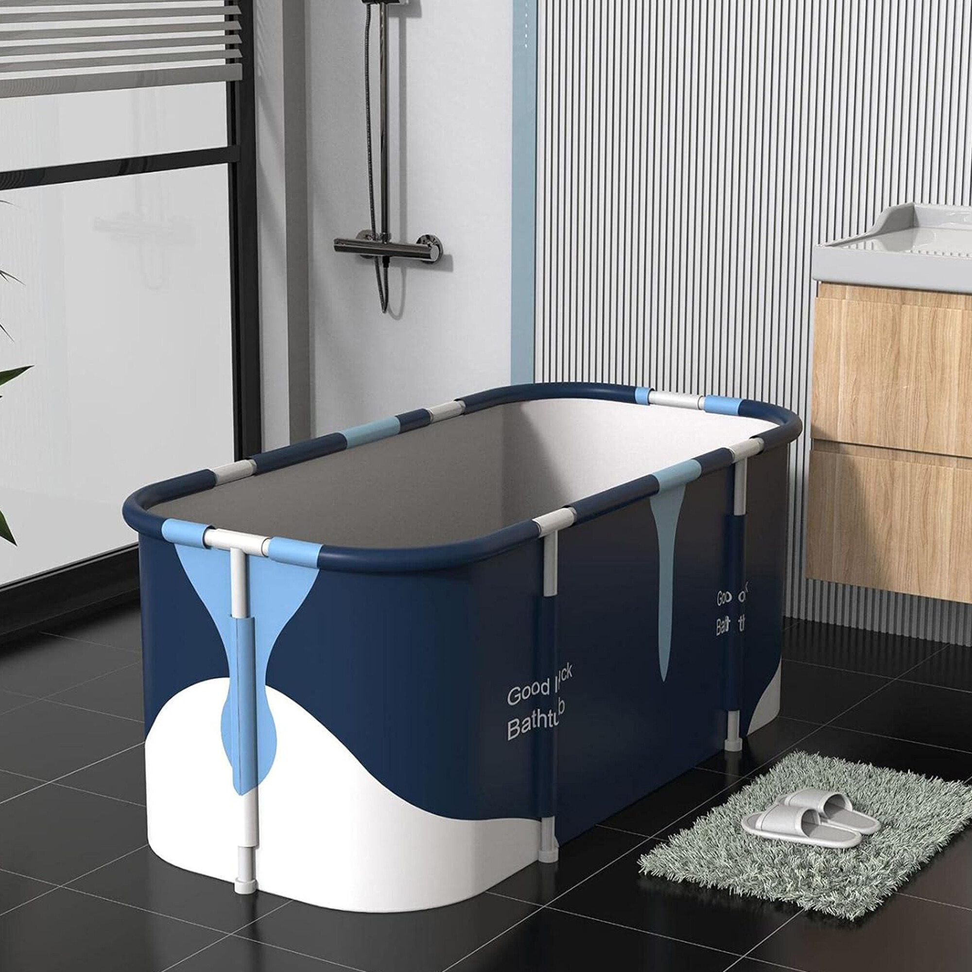 Skládací přenosná vana má rozměry 120 × 60 × 50 cm, takže nabízí dostatek prostoru pro pohodlnou koupel i v menších domácnostech.