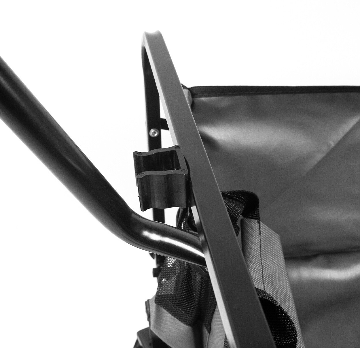 Pomocí tyče na přední straně se da vozík jednoduše posouvat. Na přední straně vozíku také najdete dvě síťované kapsy k odložení menších předmětů.