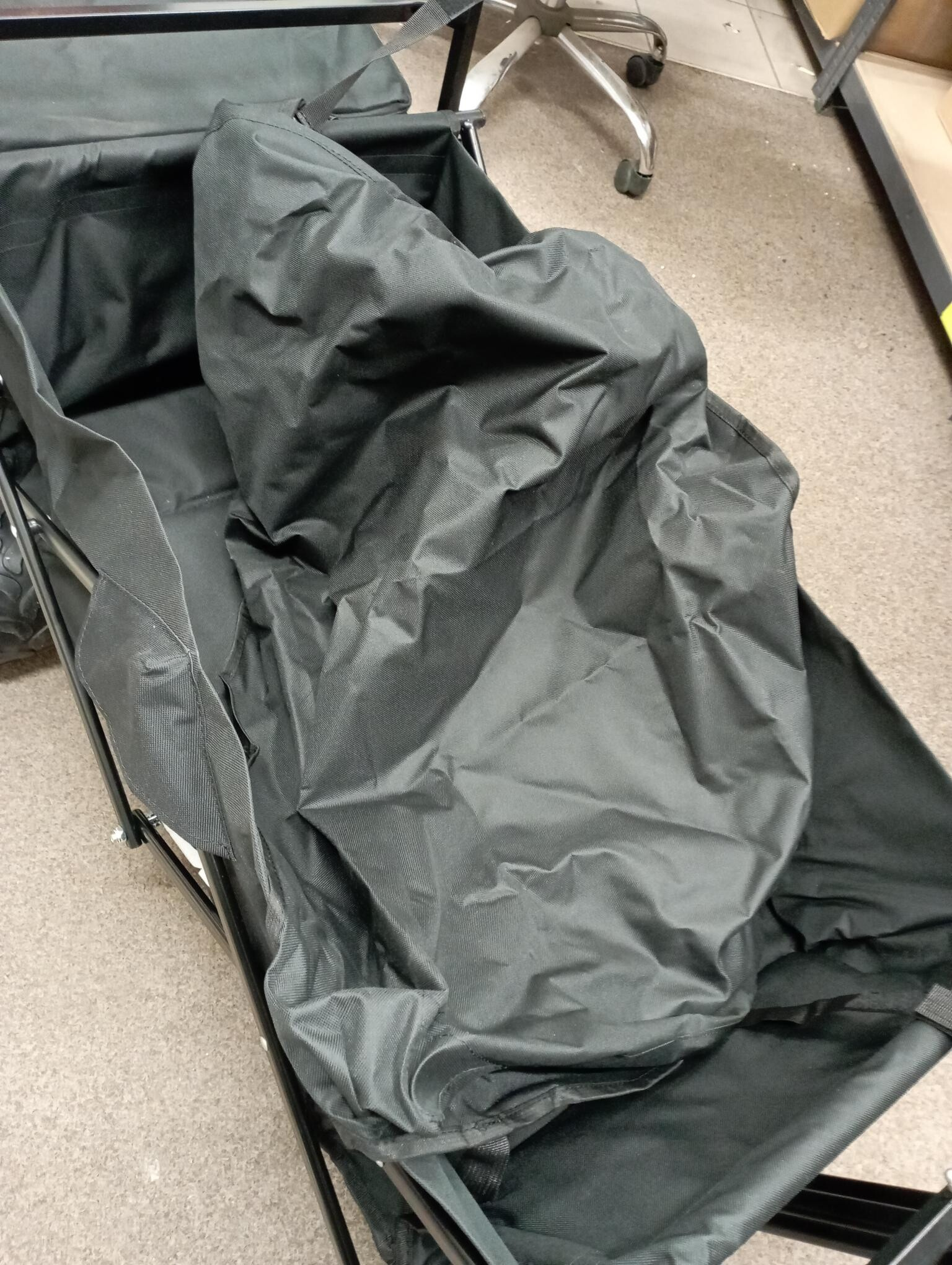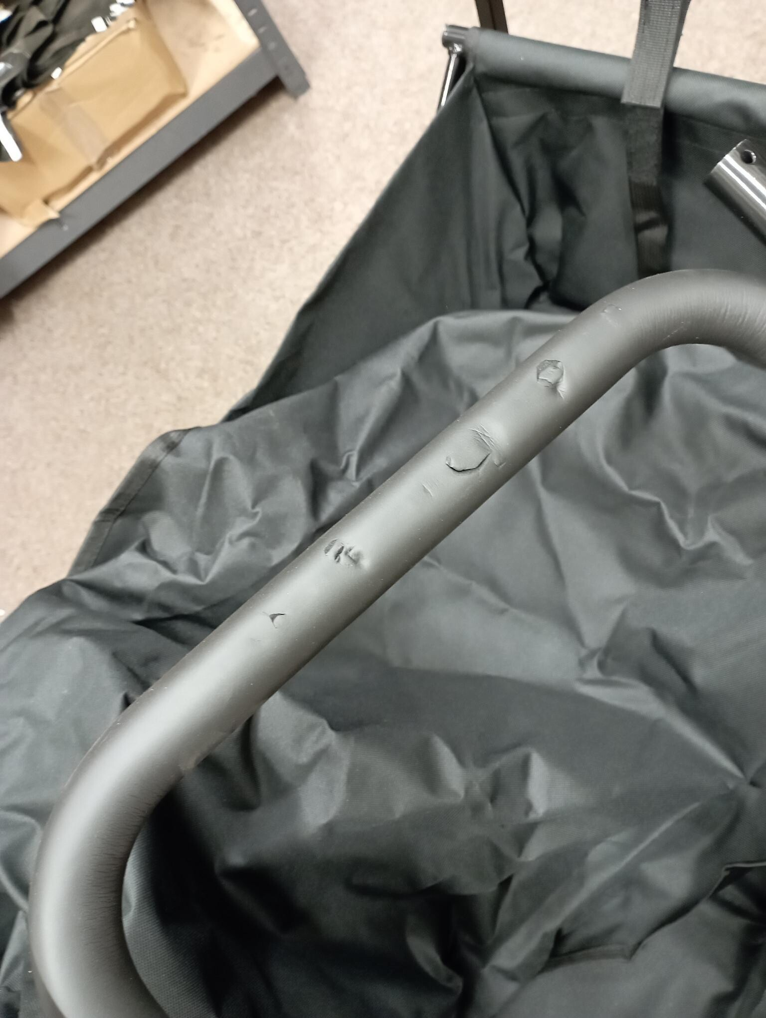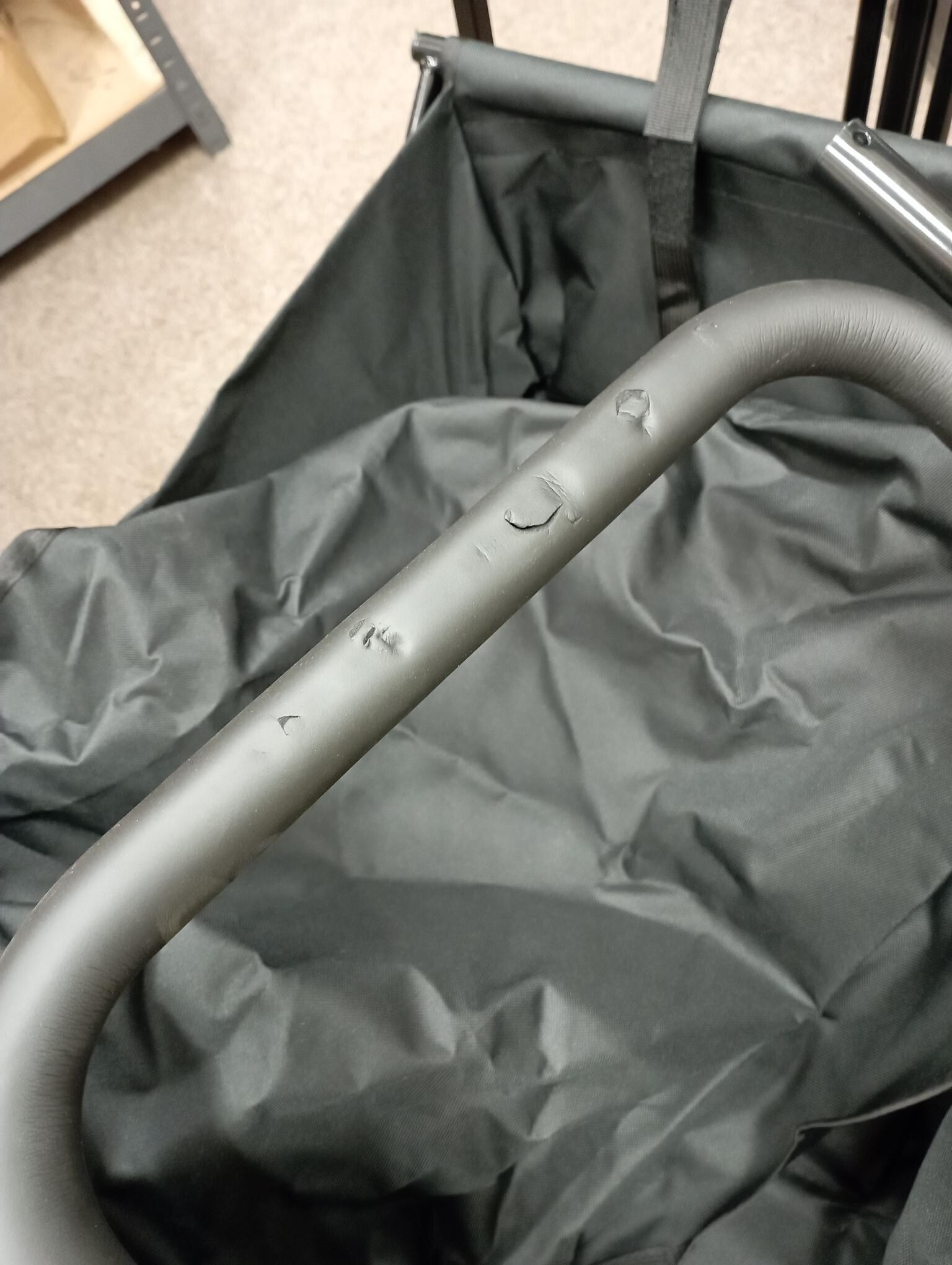Tento vozík je kompletní, stabilní a plně funkční. V rámci kontroly jsme zaznamenali drobné kosmetické nedostatky – pěnová část rukojeti je částečně poškozená a celý vozík je lehce zaprášený z uskladnění. Tyto vady jsou pouze vzhledového charakteru a nijak neomezují používání ani nosnost vozíku.