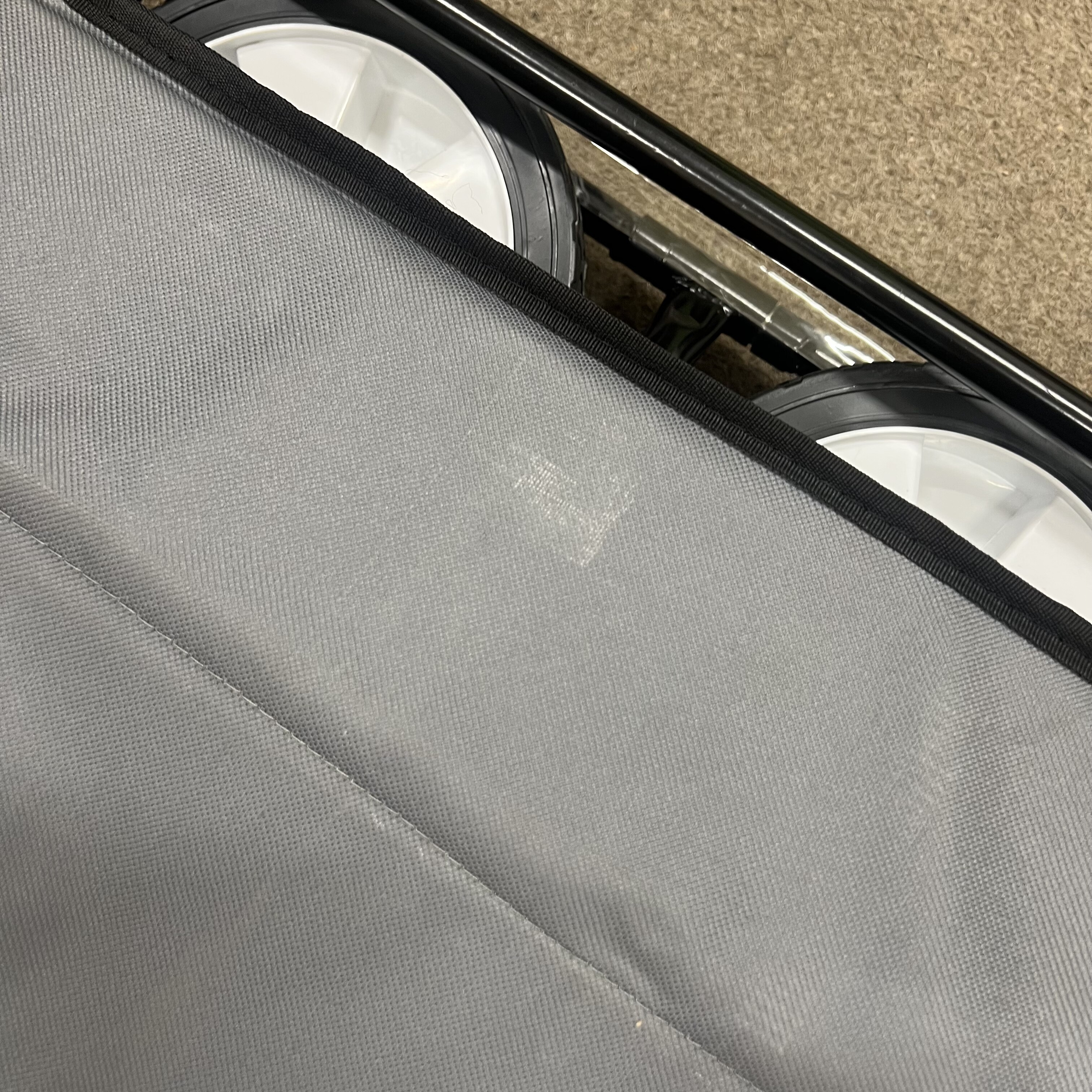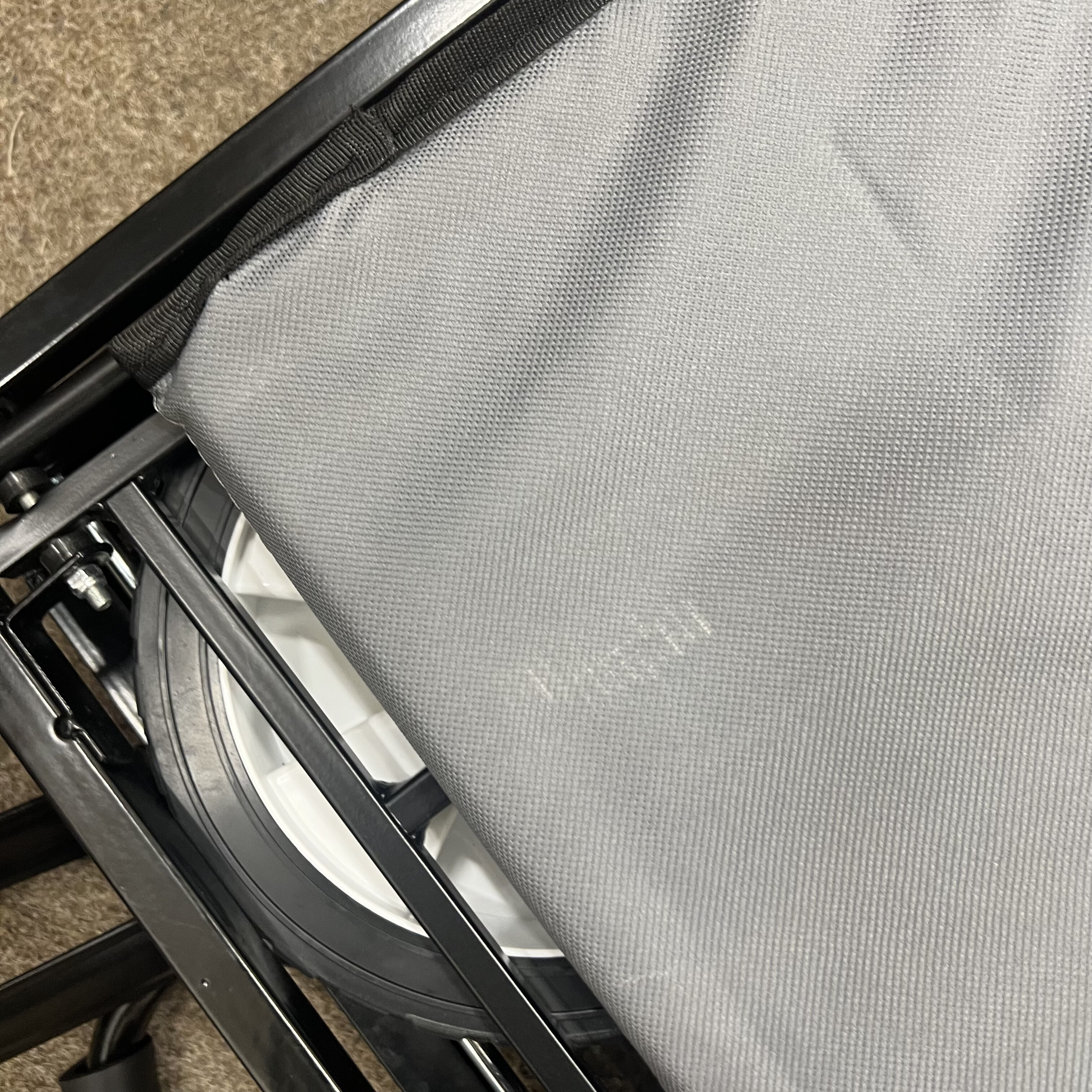 Konstrukce je mírně poškrábaná, látka jeví mírné známky poškození, viz. fotografie.