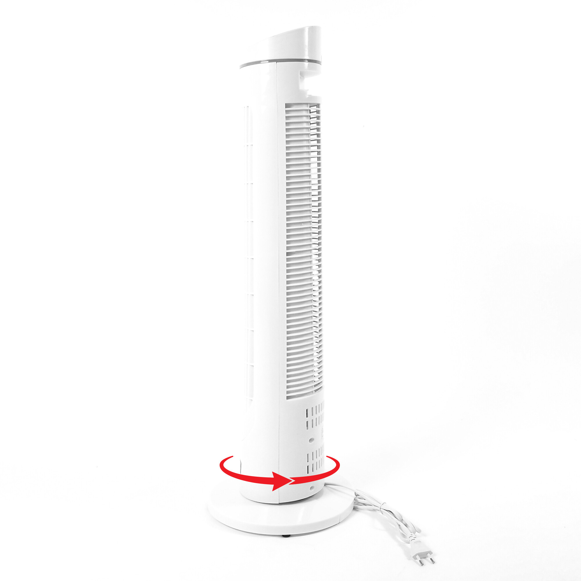 Sloupový ventilátor je vysoký 76 cm a je vybaven stabilní základnou, která zajišťuje, že se nepřevrátí.