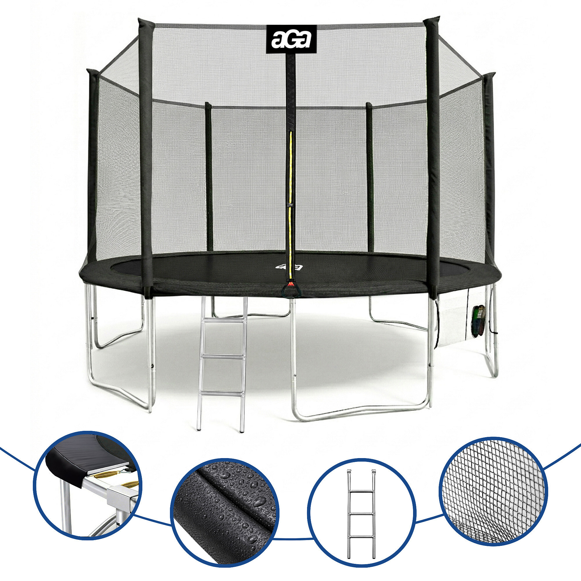 Maximální možnou bezpečnost pak zajištuje polstrovaný obvodový pás (kryt pružin), který překrývá pružiny po celém obvodu trampolíny.