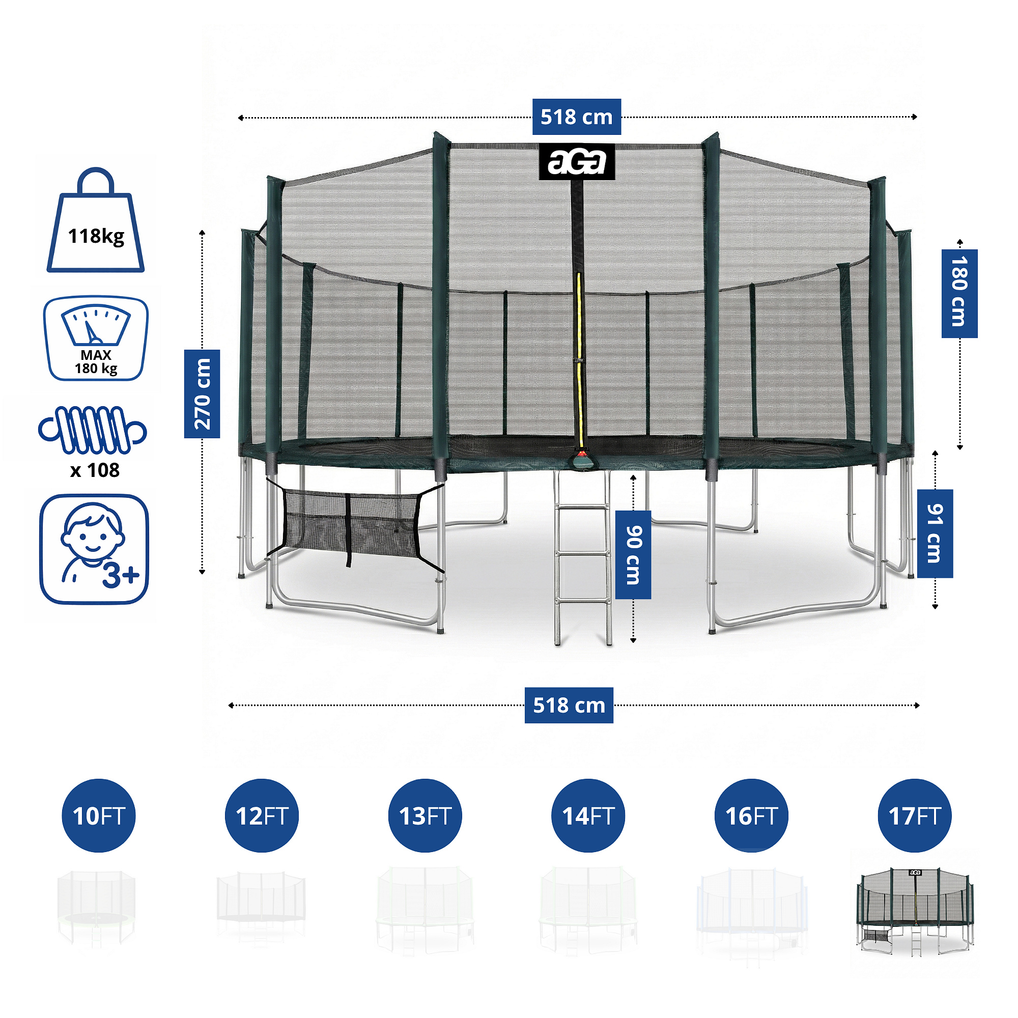 - Průměr trampolíny: 518 cm (17 ft)