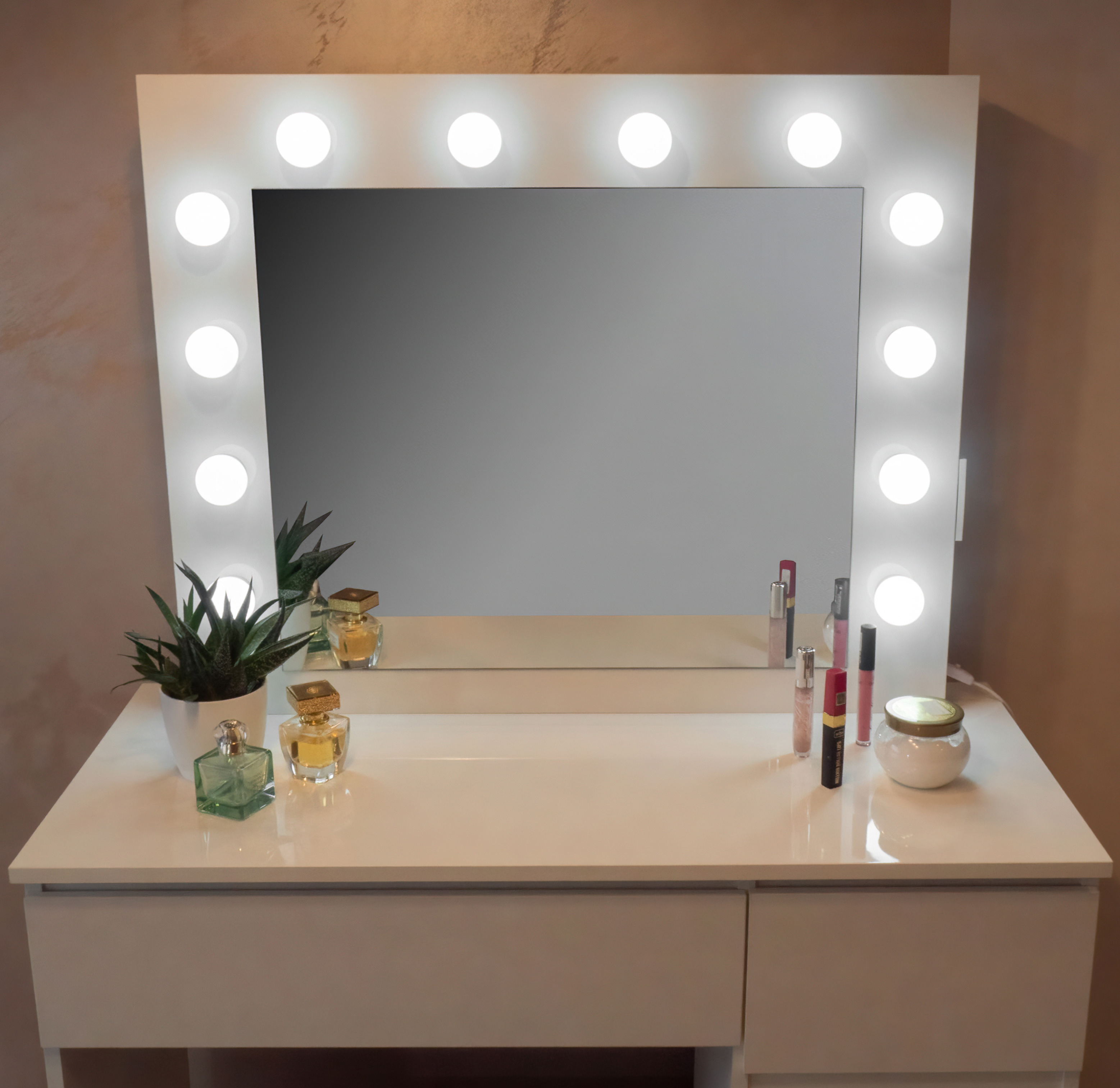 Na zrcadle je 12 LED žárovek, pohodlně se tedy nalíčíte i při špatném přirozeném světle. Na boku zrcadla je elektrická zásuvka například pro fén, žehličku na vlasy a USB přípojky pro nabíjení mobilních zařízení.