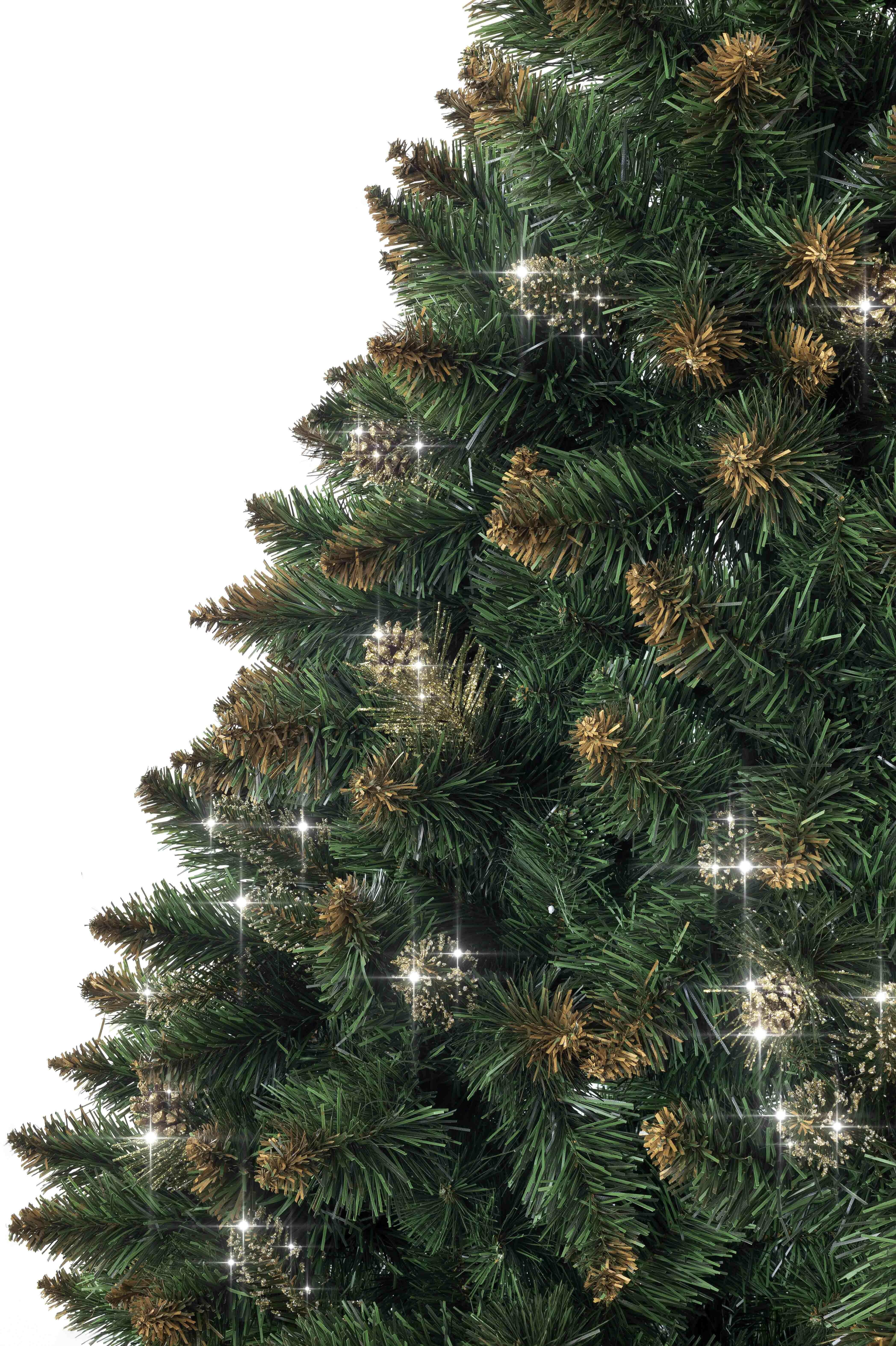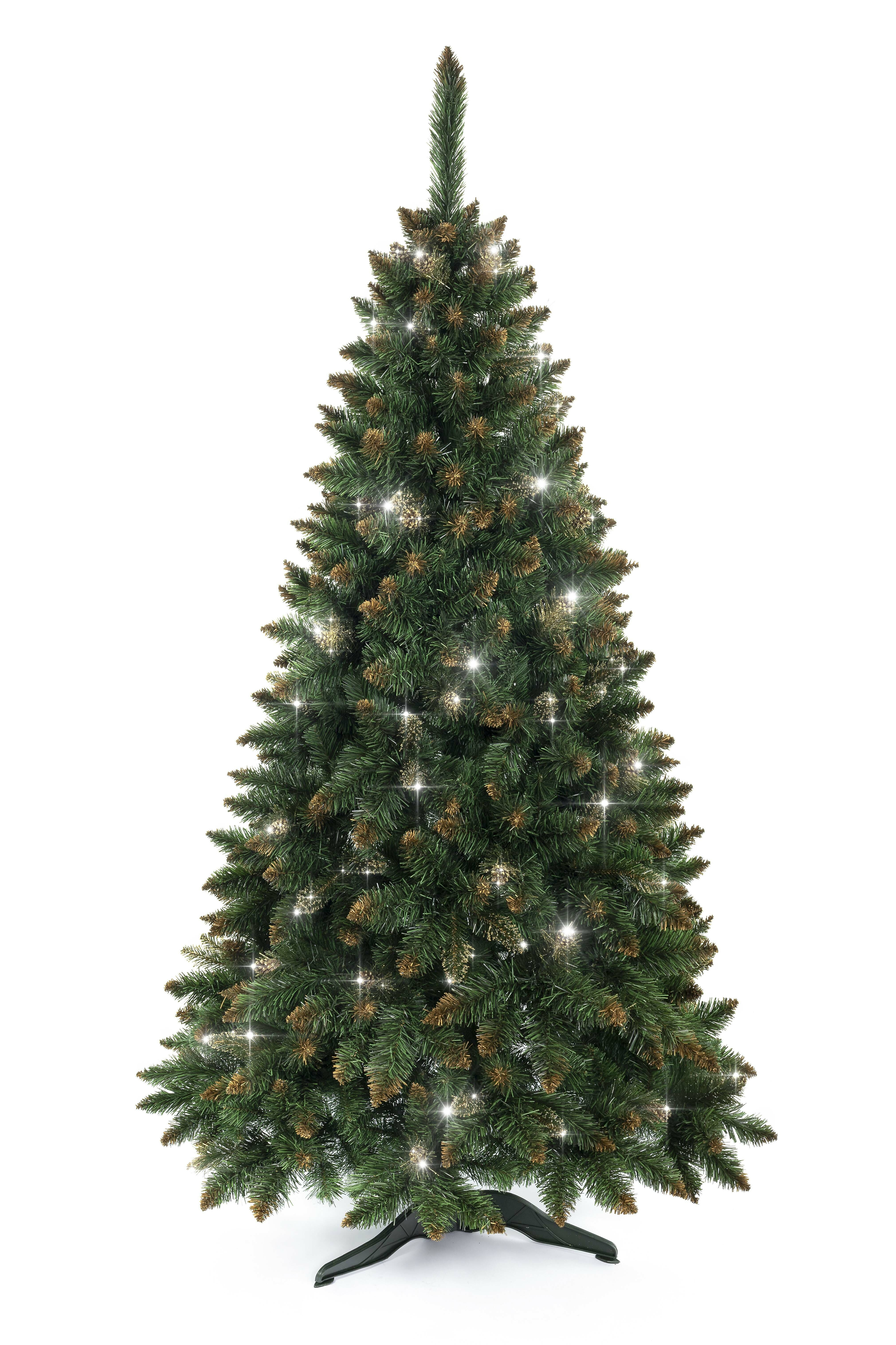 Luxusní umělý vánoční stromeček s celkovou výškou 150 cm v přírodním vzhledu krásné zelené husté borovice, která je ozdobena zlatými třpytkami.