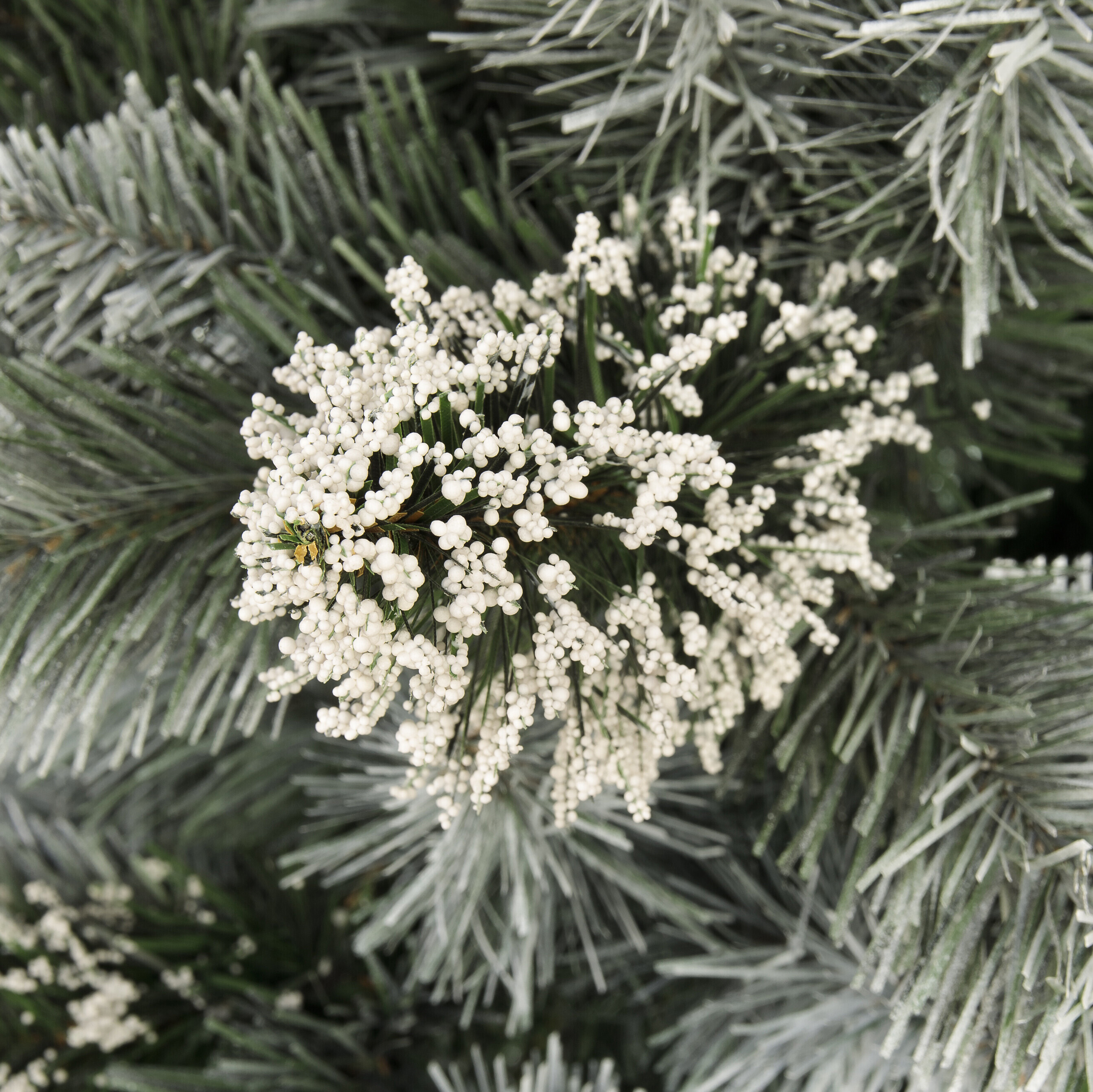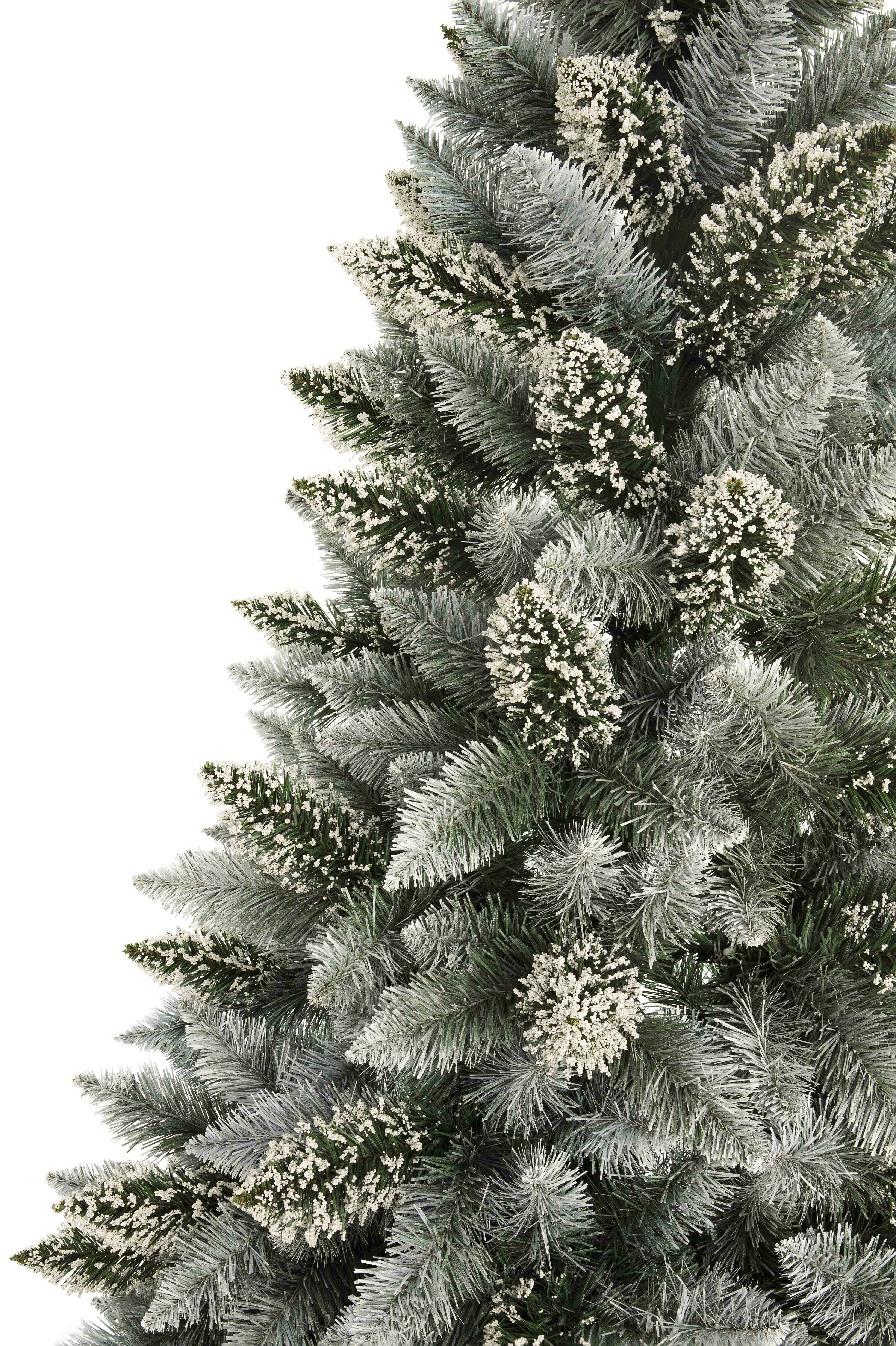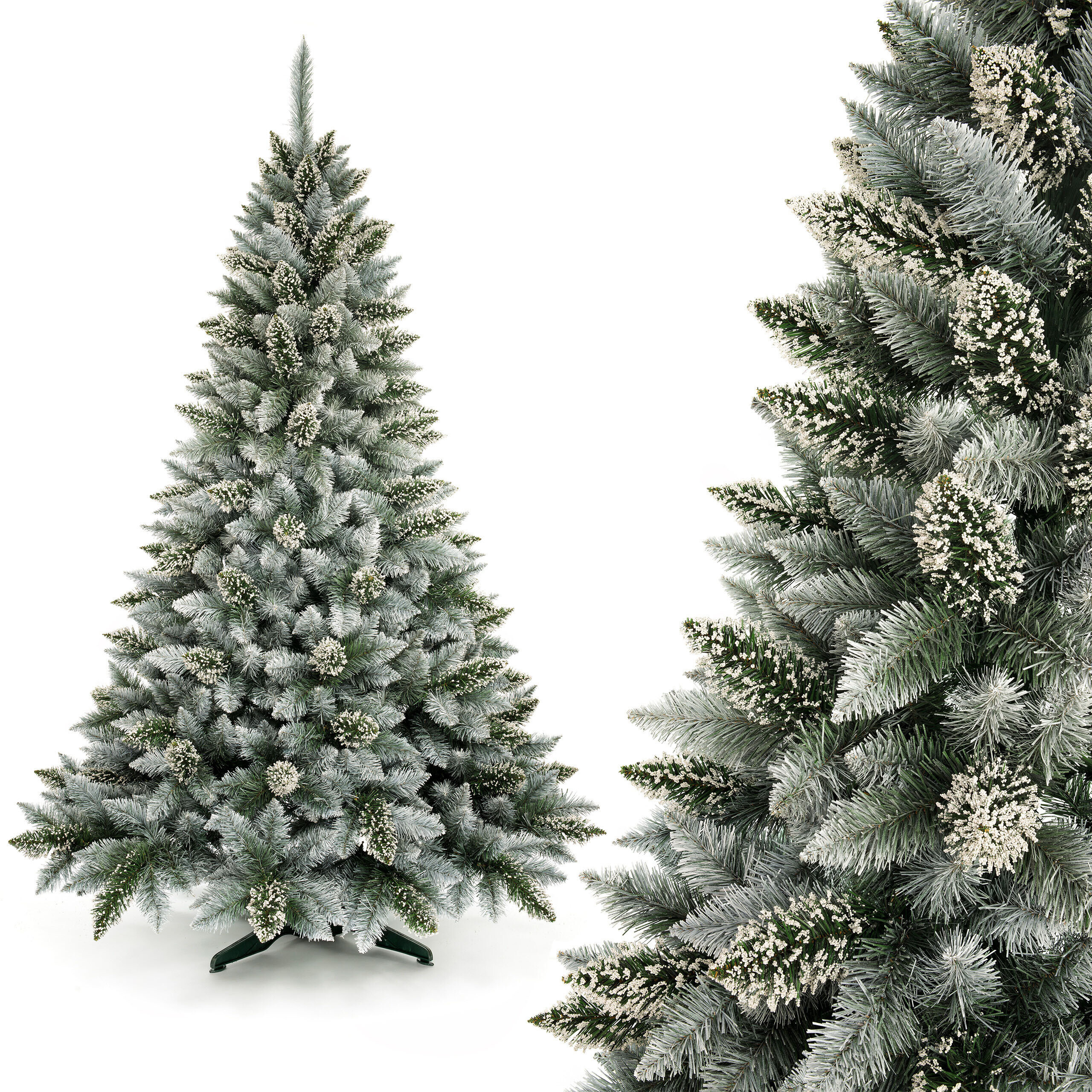 Luxusní umělý vánoční stromeček s celkovou výškou 150 cm v přírodním vzhledu zasněžené zelené husté borovice.