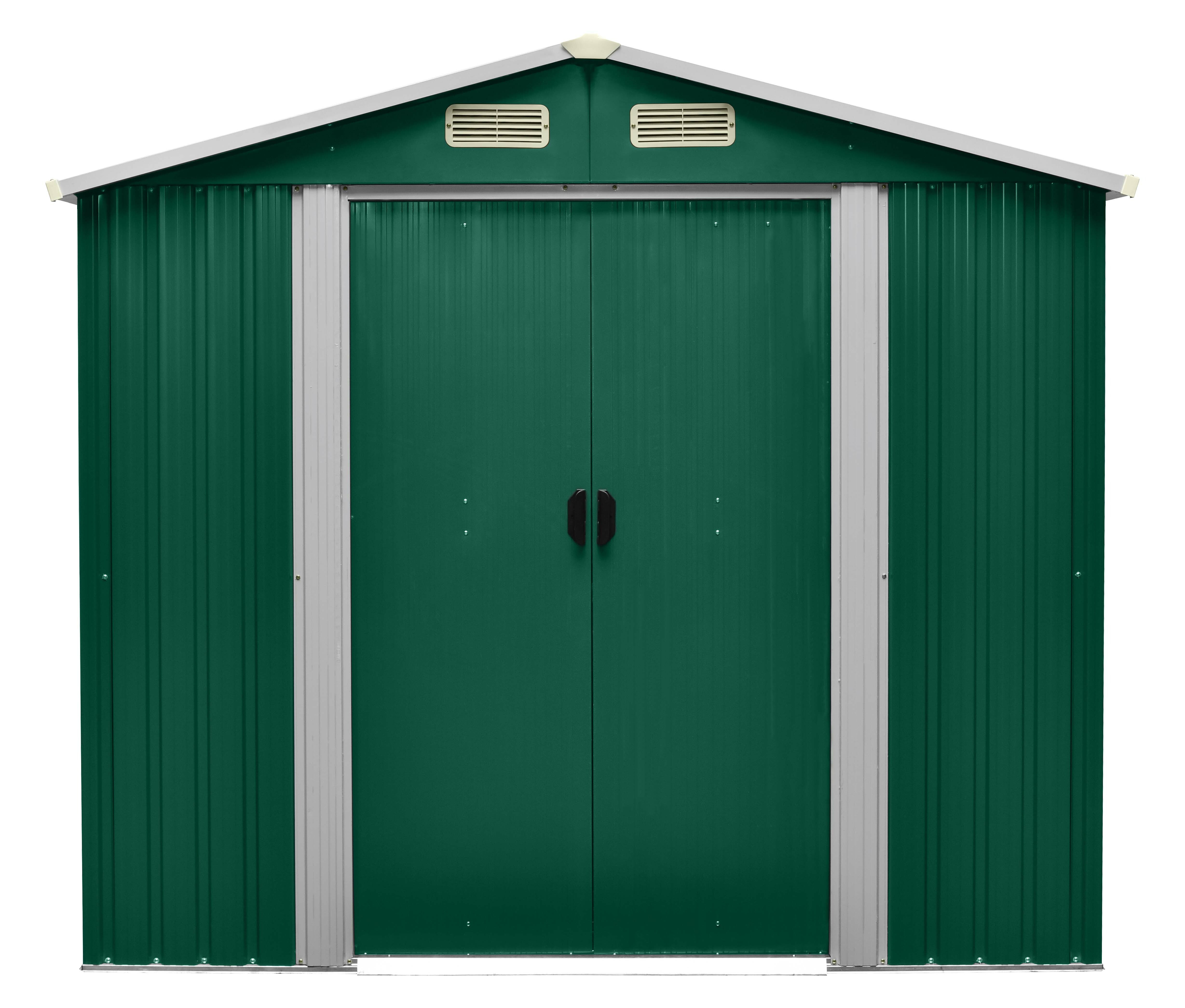 Zahradní domek má dvojité posuvné dveře o šířce 105 cm a výšce 170 cm. Součástí jsou i dveřní úchyty, díky kterým lze domek uzamknout běžným visacím zámkem.