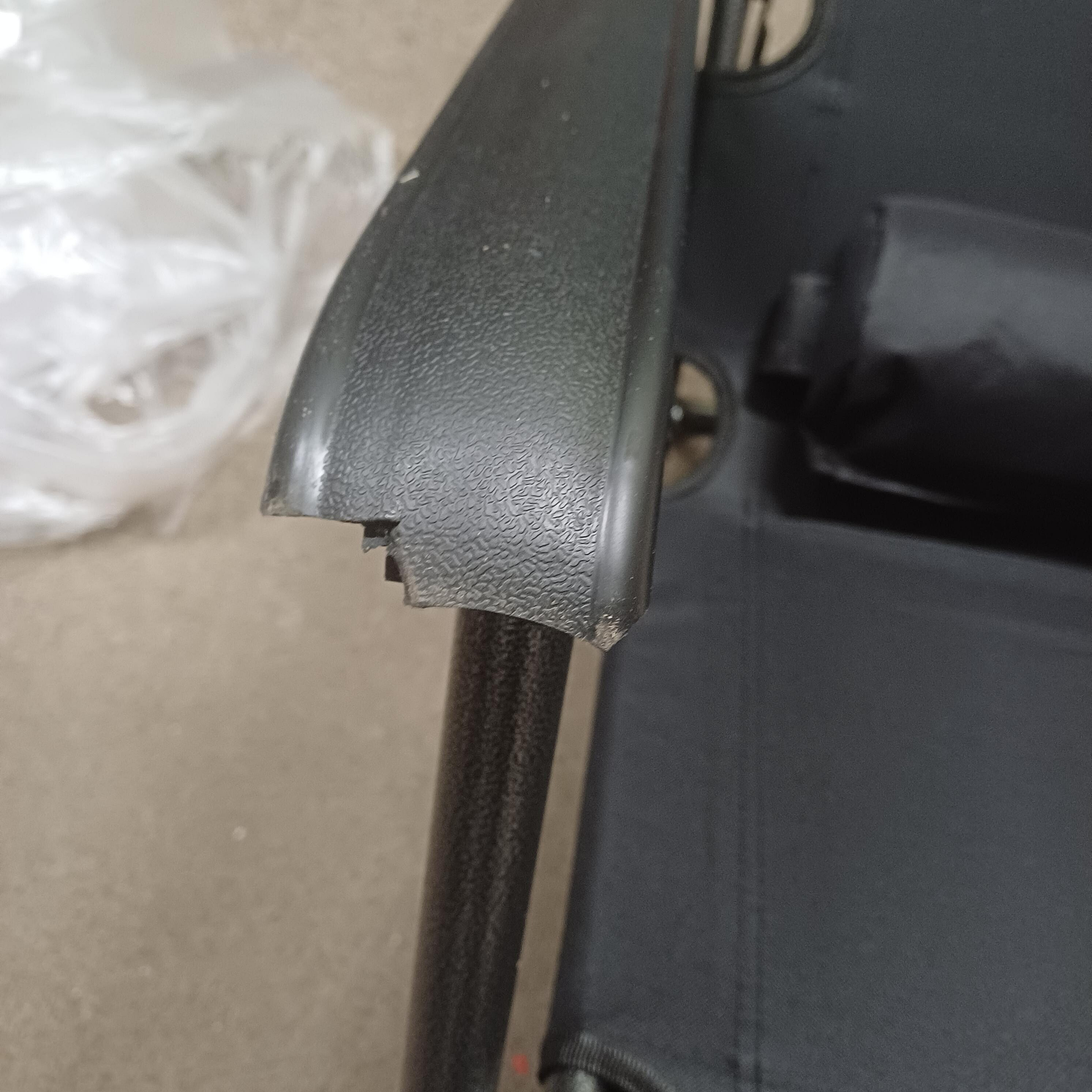 Výrobek vykazuje kosmetické vady v podobě poškrábání a otlučených loketních opěrek. Tyto nedostatky nemají vliv na funkčnost.