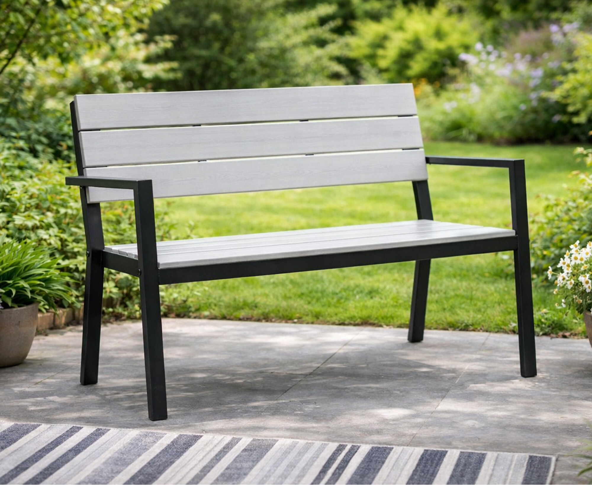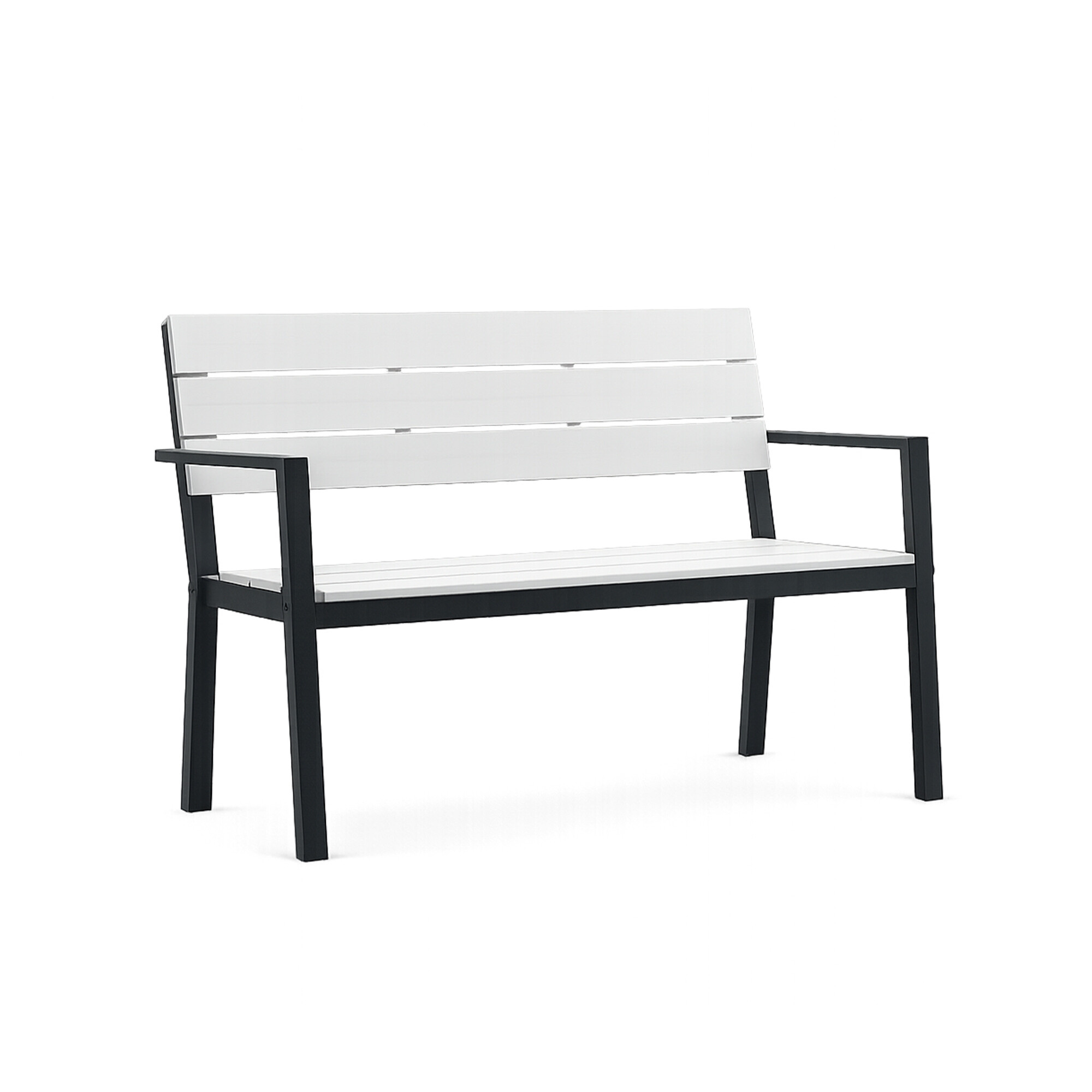 Pevná ocelová konstrukce, která je doplněna o plastové latě imitující dřevo.  Nosnost lavice 150 kg.