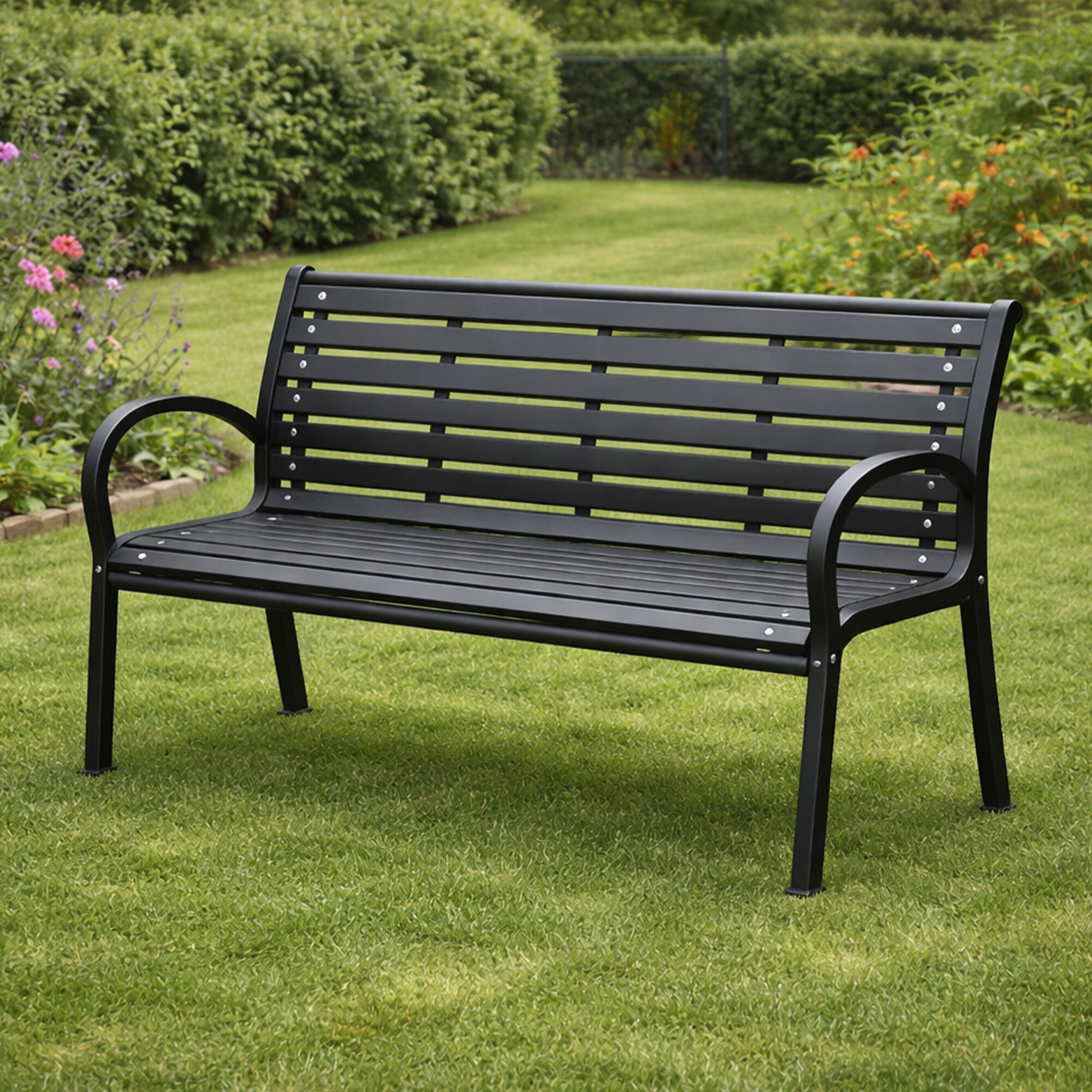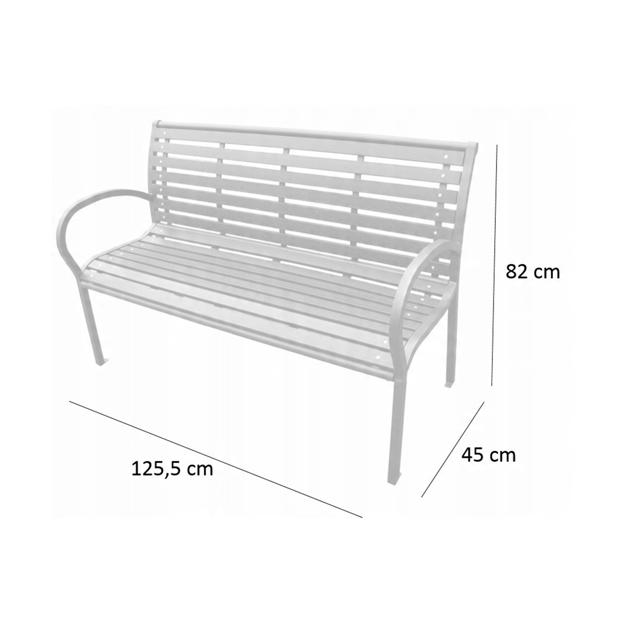 Pevná ocelová konstrukce, která je doplněna o plastové latě imitující dřevo.  Nosnost lavice 150 kg.